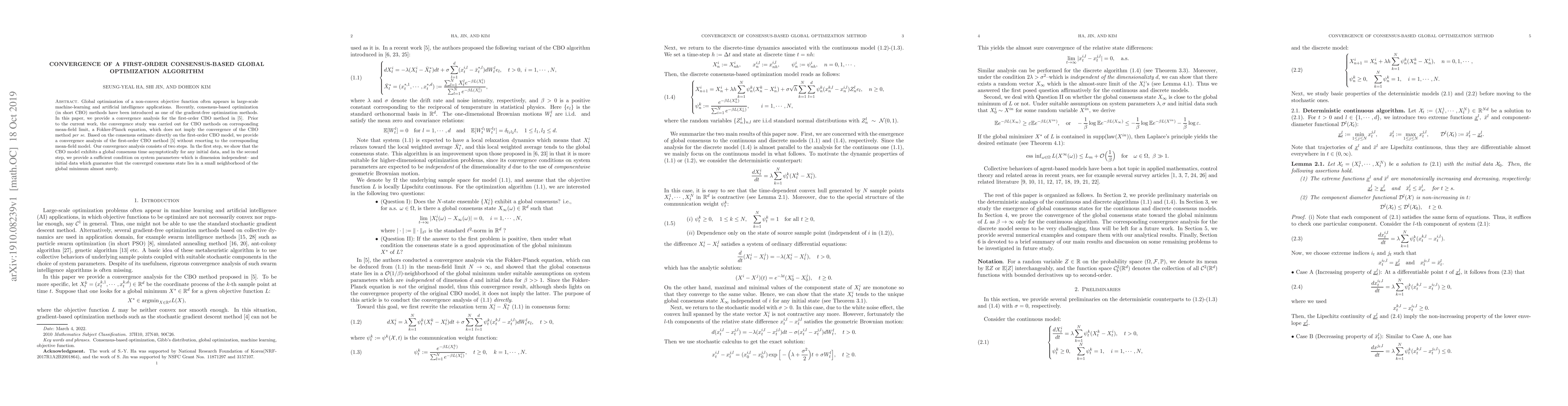 This paper analyzes the convergence of a first-order consensus-based optimization (CBO) method for non-convex global optimization problems. It provides a direct convergence analysis without relying on mean-field models, showing global consensus time asymptotically and a sufficient condition for convergence to the global minimum.