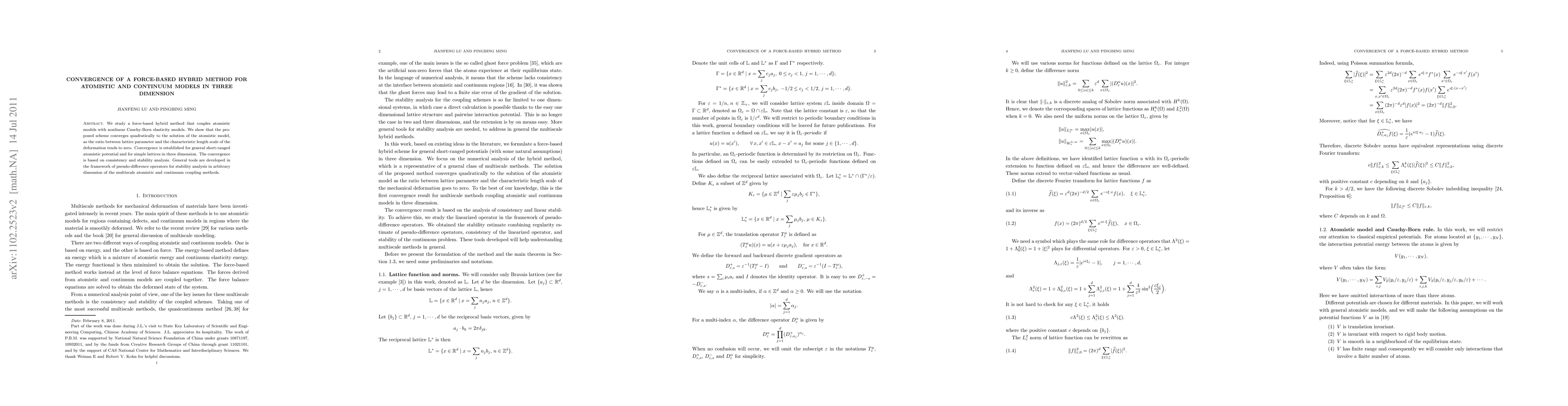 This paper presents a force-based hybrid method that combines atomistic models with nonlinear Cauchy-Born elasticity, demonstrating quadratic convergence to the atomistic model solution as the lattice parameter approaches zero. The convergence is established through consistency and stability analysis, with tools developed for pseudo-difference operators in multiscale coupling methods.