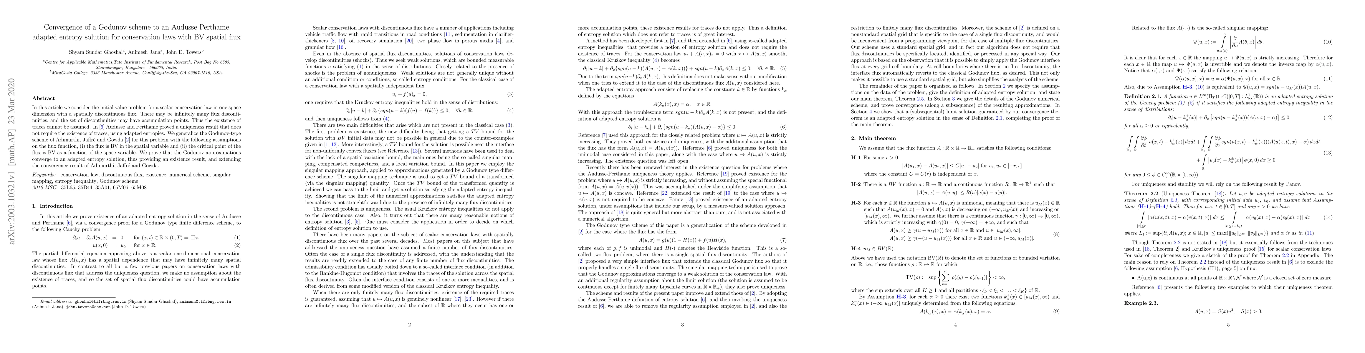 In this article we consider the initial value problem for a scalar conservation law in one space dimension with a spatially discontinuous flux. There may be infinitely many flux discontinuities, and the set of discontinuities may have accumulation points. Thus the existence of traces cannot be assumed. In [6] Audusse and Perthame proved a uniqueness result that does not require the existence of traces, using adapted entropies. We generalize the Godunov-type scheme of Adimurthi, Jaffre and Gowda [2] for this problem with the following assumptions on the flux function, (i) the flux is BV in the spatial variable and (ii) the critical point of the flux is BV as a function of the space variable. We prove that the Godunov approximations converge to an adapted entropy solution, thus providing an existence result, and extending the convergence result of Adimurthi, Jaffre and Gowda.