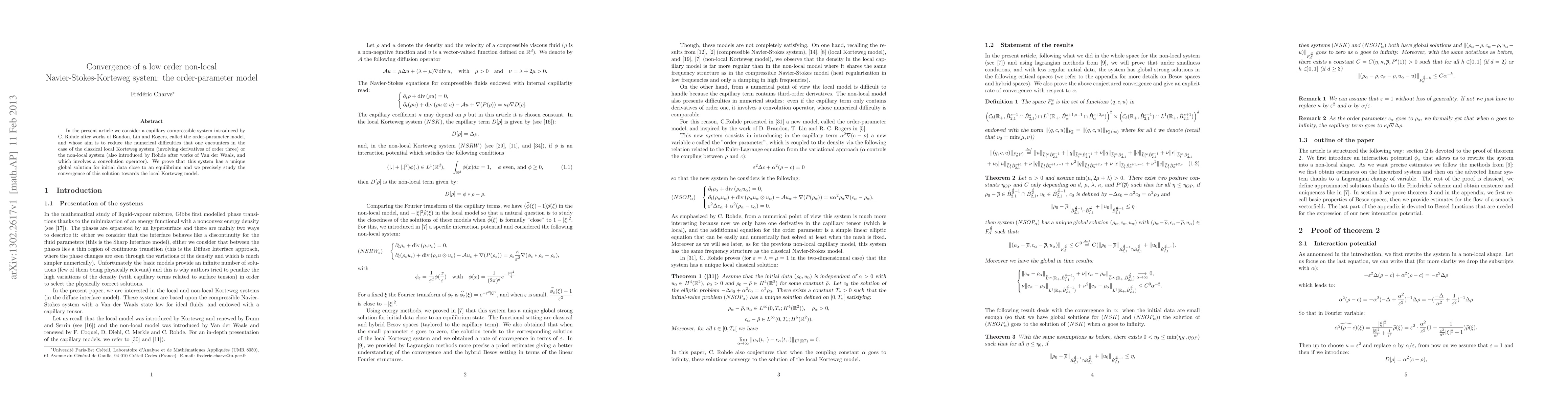 In the present article we consider a capillary compressible system introduced by C. Rohde after works of Bandon, Lin and Rogers, called the order-parameter model, and whose aim is to reduce the numerical difficulties that one encounters in the case of the classical local Korteweg system (involving derivatives of order three) or the non-local system (also introduced by Rohde after works of Van der Waals, and which involves a convolution operator). We prove that this system has a unique global solution for initial data close to an equilibrium and we precisely study the convergence of this solution towards the local Korteweg model.