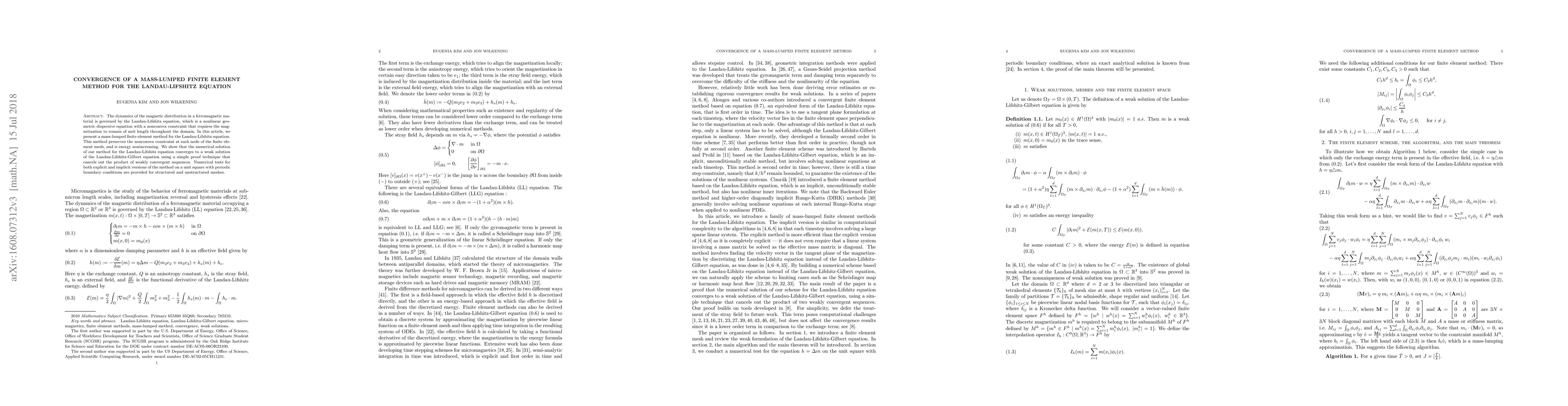 This paper proposes a mass-lumped finite element method for solving the Landau-Lifshitz equation, ensuring the magnetization constraint and energy nonincreasing properties. It demonstrates convergence to a weak solution of the Landau-Lifshitz-Gilbert equation, supported by numerical tests on both structured and unstructured meshes.