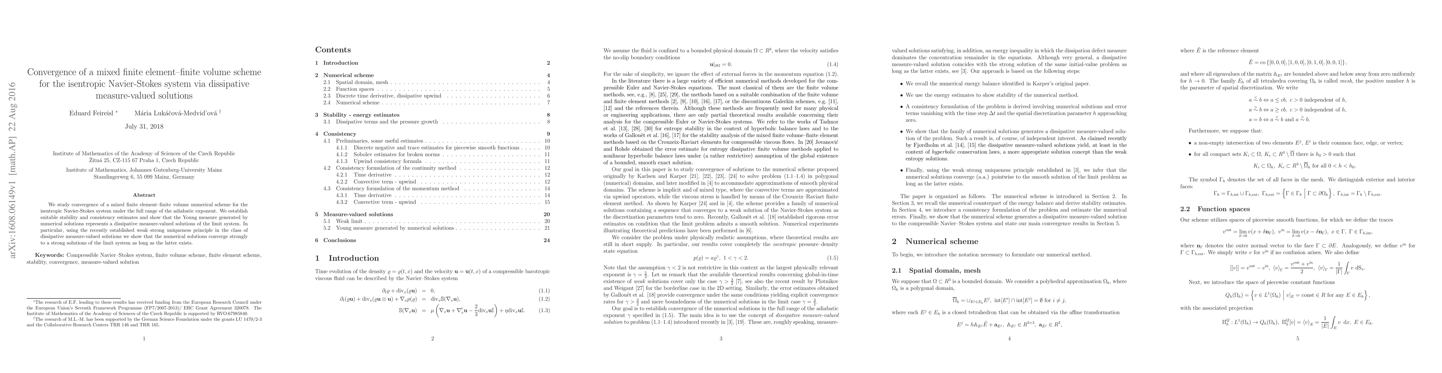 This paper investigates the convergence of a mixed finite element finite volume scheme for the isentropic Navier-Stokes system, proving stability and consistency. It demonstrates that the Young measure from numerical solutions corresponds to dissipative measure-valued solutions, ensuring strong convergence to strong solutions when they exist.