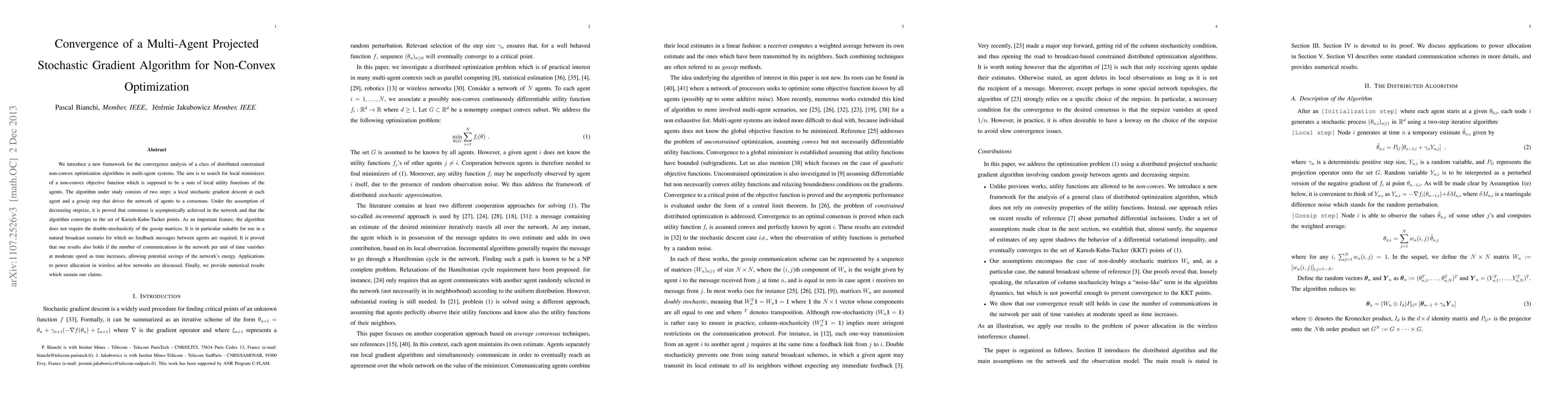 We introduce a new framework for the convergence analysis of a class of distributed constrained non-convex optimization algorithms in multi-agent systems. The aim is to search for local minimizers of a non-convex objective function which is supposed to be a sum of local utility functions of the agents. The algorithm under study consists of two steps: a local stochastic gradient descent at each agent and a gossip step that drives the network of agents to a consensus. Under the assumption of decreasing stepsize, it is proved that consensus is asymptotically achieved in the network and that the algorithm converges to the set of Karush-Kuhn-Tucker points. As an important feature, the algorithm does not require the double-stochasticity of the gossip matrices. It is in particular suitable for use in a natural broadcast scenario for which no feedback messages between agents are required. It is proved that our result also holds if the number of communications in the network per unit of time vanishes at moderate speed as time increases, allowing for potential savings of the network's energy. Applications to power allocation in wireless ad-hoc networks are discussed. Finally, we provide numerical results which sustain our claims.