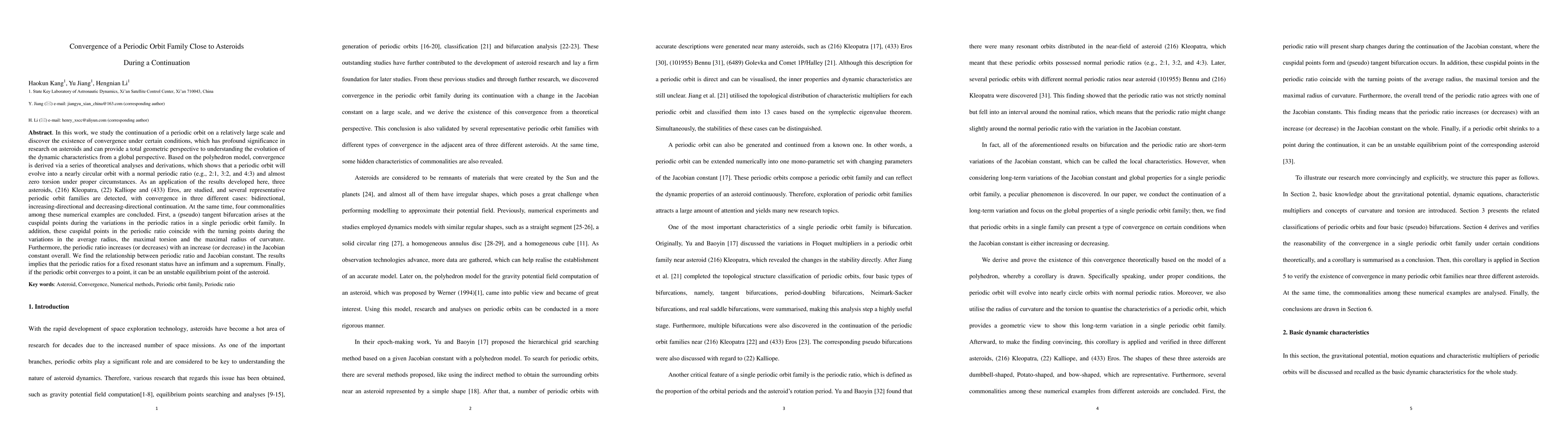 In this work, we study the continuation of a periodic orbit on a relatively large scale and discover the existence of convergence under certain conditions, which has profound significance in research on asteroids and can provide a total geometric perspective to understanding the evolution of the dynamic characteristics from a global perspective. Based on the polyhedron model, convergence is derived via a series of theoretical analyses and derivations, which shows that a periodic orbit will evolve into a nearly circular orbit with a normal periodic ratio (e.g., 2:1, 3:2, and 4:3) and almost zero torsion under proper circumstances. As an application of the results developed here, three asteroids, (216) Kleopatra, (22) Kalliope and (433) Eros, are studied, and several representative periodic orbit families are detected, with convergence in three different cases: bidirectional, increasing-directional and decreasing-directional continuation. At the same time, four commonalities among these numerical examples are concluded. First, a (pseudo) tangent bifurcation arises at the cuspidal points during the variations in the periodic ratios in a single periodic orbit family. In addition, these cuspidal points in the periodic ratio coincide with the turning points during the variations in the average radius, the maximal torsion and the maximal radius of curvature. Furthermore, the periodic ratio increases (or decreases) with an increase (or decrease) in the Jacobian constant overall. We find the relationship between periodic ratio and Jacobian constant. The results implies that the periodic ratios for a fixed resonant status have an infimum and a supremum. Finally, if the periodic orbit converges to a point, it can be an unstable equilibrium point of the asteroid.