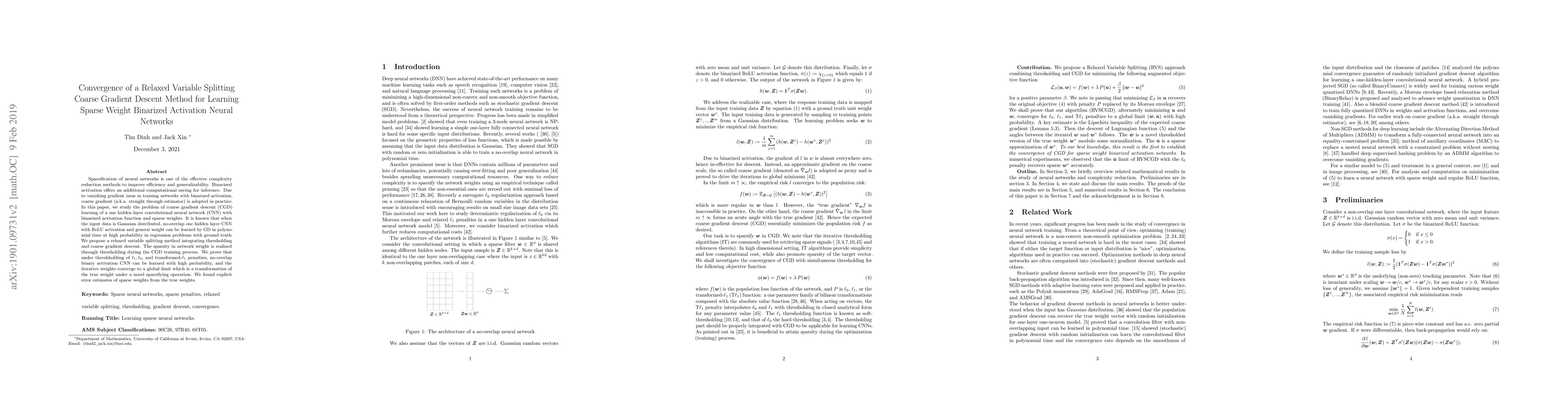 This paper proposes a novel relaxed variable splitting coarse gradient descent method for learning sparse weight binarized activation neural networks. It demonstrates the convergence of the method under $\ell_1, \ell_0,$ and transformed-$\ell_1$ penalties, providing explicit error estimates for the sparse weights.