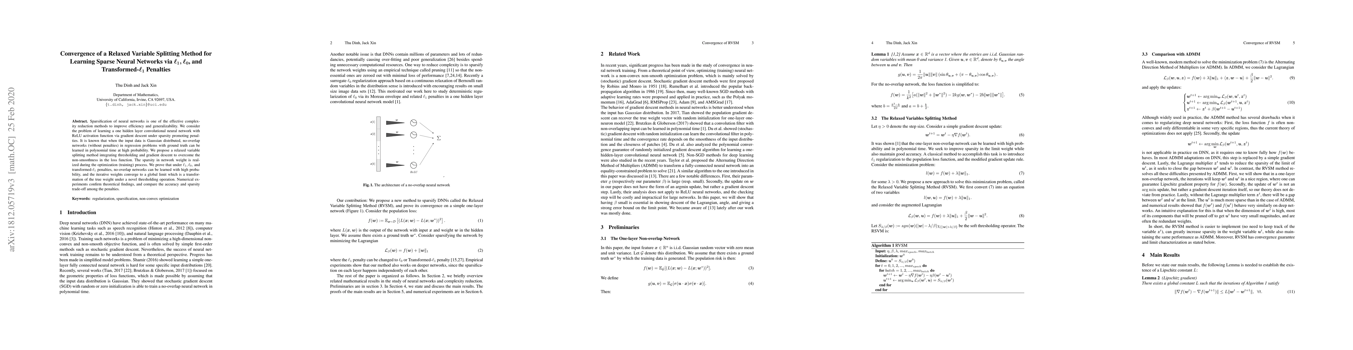 This paper proposes a relaxed variable splitting method for learning sparse neural networks using $\ell_1, \ell_0$, and transformed-$\ell_1$ penalties. It demonstrates that under these penalties, the method can learn no-overlap networks efficiently and proves convergence to a global limit.