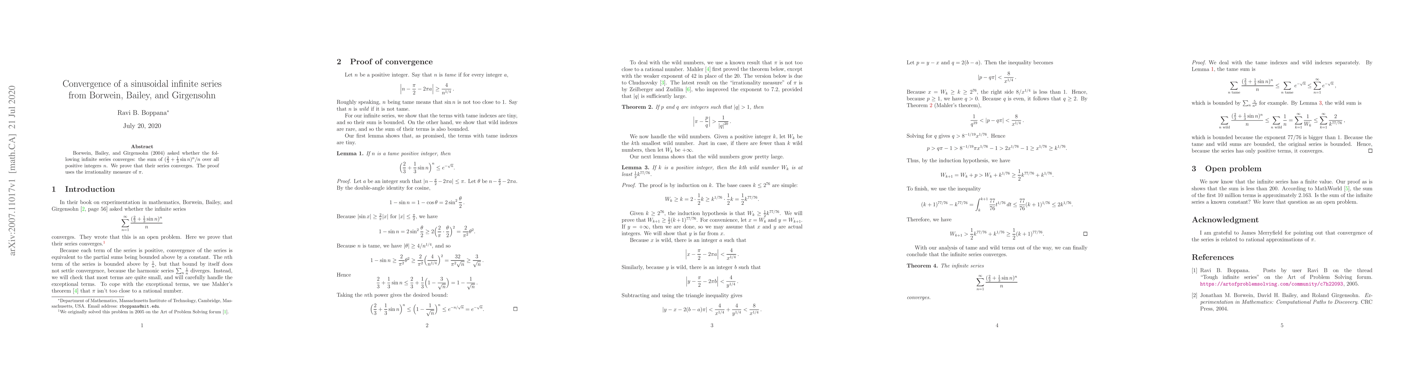Borwein, Bailey, and Girgensohn (2004) asked whether the following infinite series converges: the sum of $(\frac{2}{3} + \frac{1}{3} \sin n)^n / n$ over all positive integers $n$. We prove that their series converges. The proof uses the irrationality measure of $\pi$.