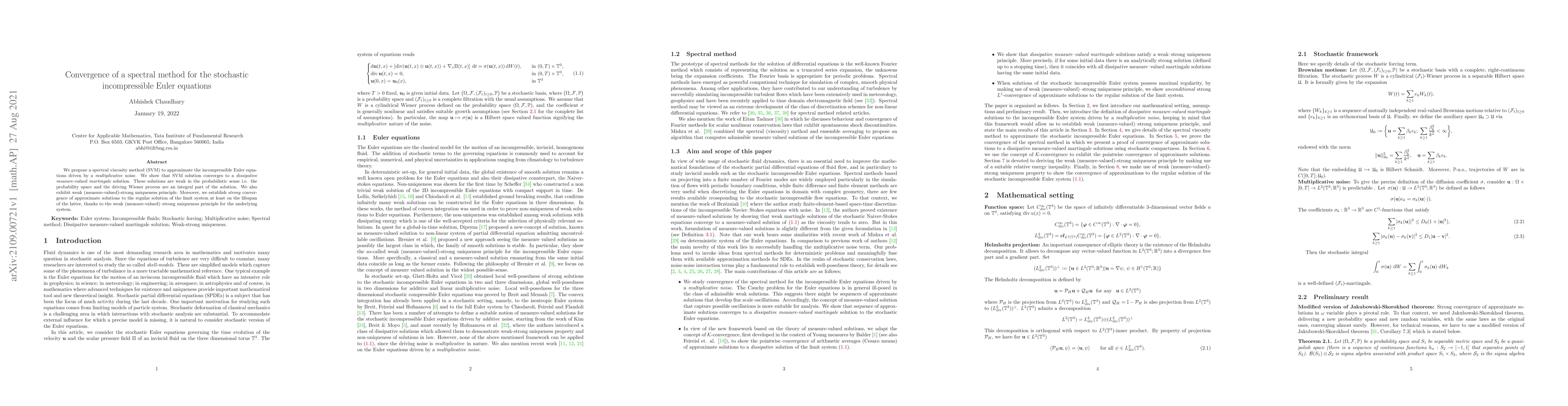 This paper proposes a spectral viscosity method (SVM) to approximate stochastic incompressible Euler equations driven by multiplicative noise, showing its convergence to a dissipative measure-valued martingale solution. It also establishes weak (measure-valued)--strong uniqueness and strong convergence of approximate solutions to the regular solution.