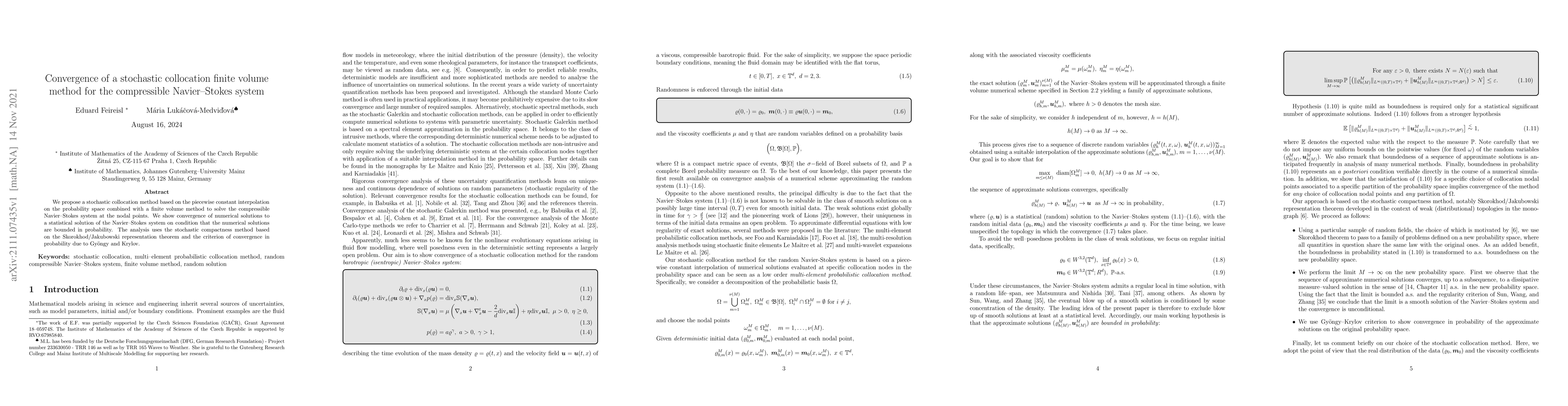 This paper proposes a stochastic collocation finite volume method for solving the compressible Navier-Stokes system, demonstrating convergence to a statistical solution under boundedness conditions. The analysis employs the stochastic compactness method and convergence criteria based on the Skorokhod/Jakubowski representation theorem and Gyöngy-Krylov results.