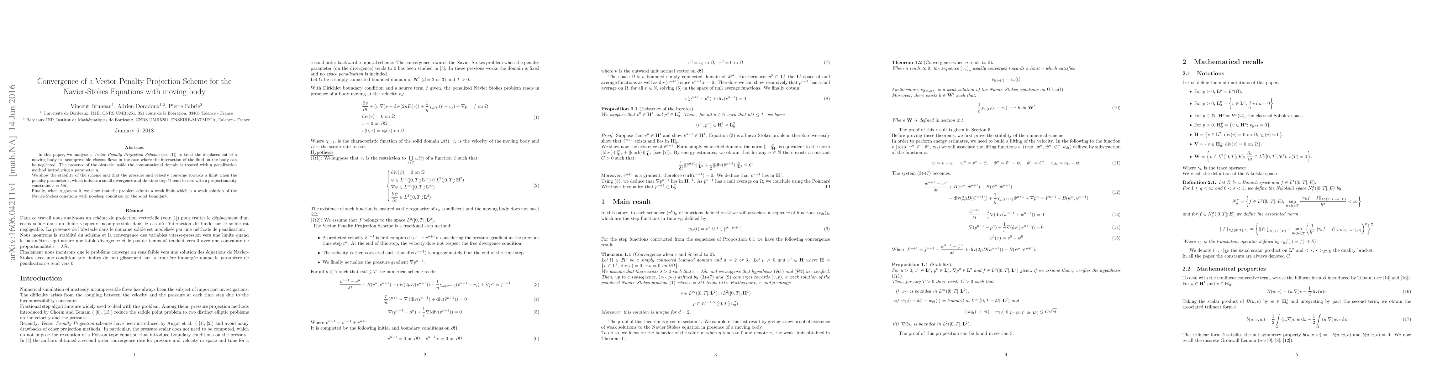 In this paper, we analyse a Vector Penalty Projection Scheme (see [1]) to treat the displacement of a moving body in incompressible viscous flows in the case where the interaction of the fluid on the body can be neglected. The presence of the obstacle inside the computational domain is treated with a penalization method introducing a parameter $\eta$. We show the stability of the scheme and that the pressure and velocity converge towards a limit when the penalty parameter $\epsilon$, which induces a small divergence and the time step $\delta$t tend to zero with a proportionality constraint $\epsilon$ = $\lambda$$\delta$t. Finally, when $\eta$ goes to 0, we show that the problem admits a weak limit which is a weak solution of the Navier-Stokes equations with no-sleep condition on the solid boundary. R{\'e}sum{\'e} Dans ce travail nous analysons un sch{\'e}ma de projection vectorielle (voir [1]) pour traiter le d{\'e}placement d'un corps solide dans un fluide visqueux incompressible dans le cas o` u l'interaction du fluide sur le solide est n{\'e}gligeable. La pr{\'e}sence de l'obstacle dans le domaine solide est mod{\'e}lis{\'e}e par une m{\'e}thode de p{\'e}nalisation. Nous montrons la stabilit{\'e} du sch{\'e}ma et la convergence des variables vitesse-pression vers une limite quand le param etre $\epsilon$ qui assure une faible divergence et le pas de temps $\delta$t tendent vers 0 avec une contrainte de proportionalit{\'e} $\epsilon$ = $\lambda$$\delta$t. Finalement nous montrons que leprob{\`i} eme converge au sens faible vers une solution des equations de Navier-Stokes avec une condition aux limites de non glissement sur lafront{\`i} ere immerg{\'e}e quand le param etre de p{\'e}nalisation $\eta$ tend vers 0.