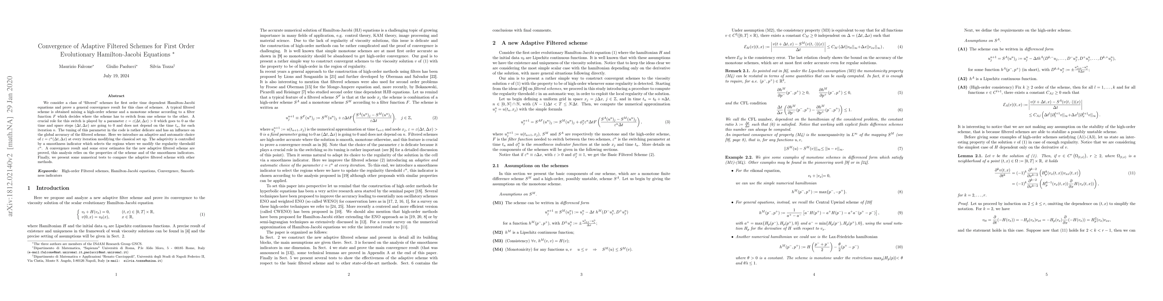 We consider a class of "filtered" schemes for first order time dependent Hamilton-Jacobi equations and prove a general convergence result for this class of schemes. A typical filtered scheme is obtained mixing a high-order scheme and a monotone scheme according to a filter function $F$ which decides where the scheme has to switch from one scheme to the other. A crucial role for this switch is played by a parameter $\varepsilon=\varepsilon({\Delta t,\Delta x})>0$ which goes to 0 as the time and space steps $(\Delta t,\Delta x)$ are going to 0 and does not depend on the time $t_n$, for each iteration $n$. The tuning of this parameter in the code is rather delicate and has an influence on the global accuracy of the filtered scheme. Here we introduce an adaptive and automatic choice of $\varepsilon=\varepsilon ^n (\Delta t, \Delta x)$ at every iteration modifying the classical set up. The adaptivity is controlled by a smoothness indicator which selects the regions where we modify the regularity threshold $\varepsilon^n$. A convergence result and some error estimates for the new adaptive filtered scheme are proved, this analysis relies on the properties of the scheme and of the smoothness indicators. Finally, we present some numerical tests to compare the adaptive filtered scheme with other methods.