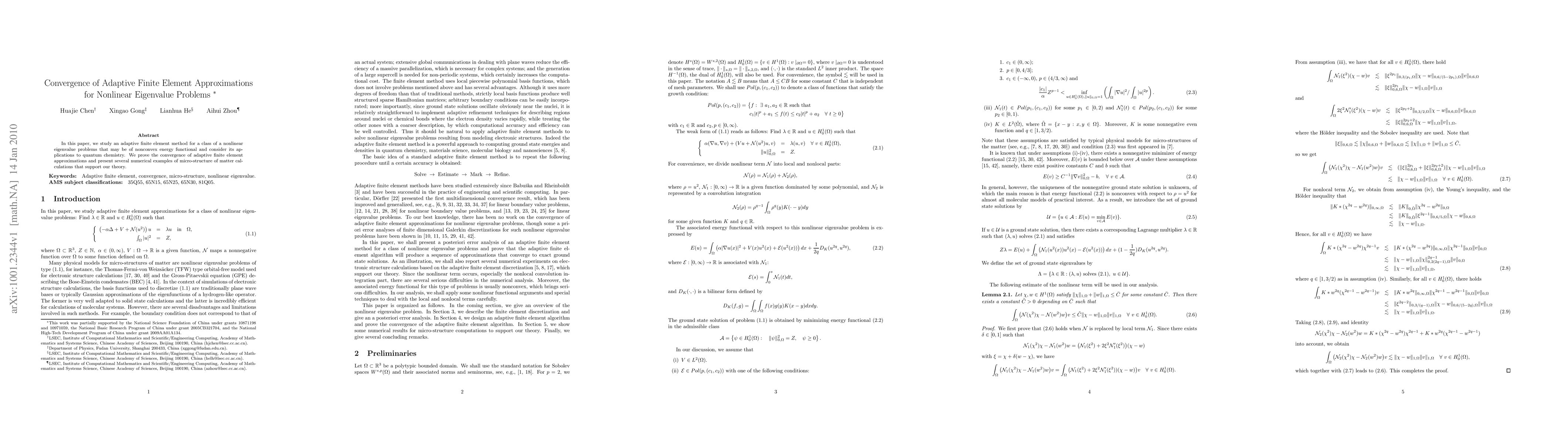 This paper investigates an adaptive finite element method for solving nonlinear eigenvalue problems, particularly those related to nonconvex energy functionals, with applications in quantum chemistry. The authors prove the convergence of the adaptive method and validate it through numerical examples demonstrating micro-structure calculations.
