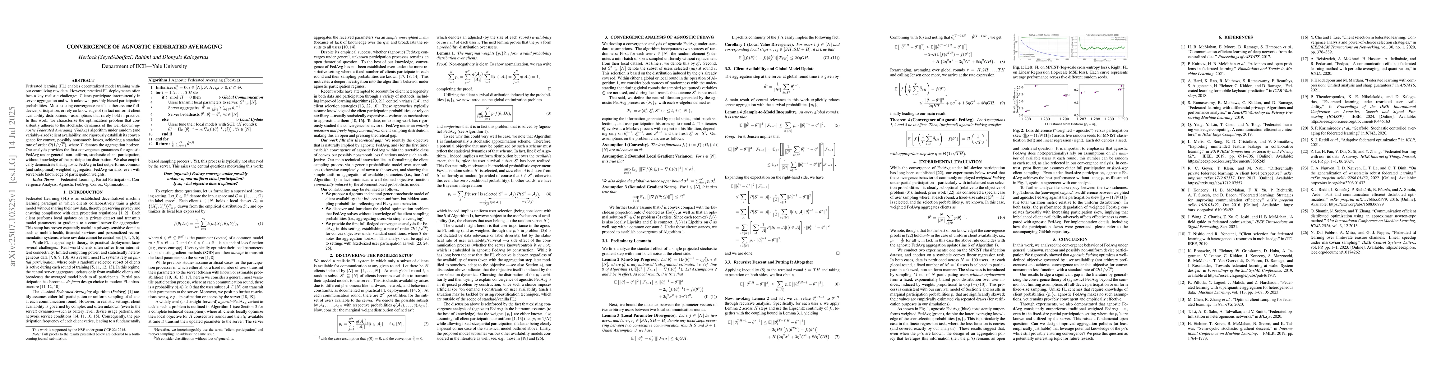 Federated learning (FL) enables decentralized model training without centralizing raw data. However, practical FL deployments often face a key realistic challenge: Clients participate intermittently in server aggregation and with unknown, possibly biased participation probabilities. Most existing convergence results either assume full-device participation, or rely on knowledge of (in fact uniform) client availability distributions -- assumptions that rarely hold in practice. In this work, we characterize the optimization problem that consistently adheres to the stochastic dynamics of the well-known \emph{agnostic Federated Averaging (FedAvg)} algorithm under random (and variably-sized) client availability, and rigorously establish its convergence for convex, possibly nonsmooth losses, achieving a standard rate of order $\mathcal{O}(1/\sqrt{T})$, where $T$ denotes the aggregation horizon. Our analysis provides the first convergence guarantees for agnostic FedAvg under general, non-uniform, stochastic client participation, without knowledge of the participation distribution. We also empirically demonstrate that agnostic FedAvg in fact outperforms common (and suboptimal) weighted aggregation FedAvg variants, even with server-side knowledge of participation weights.