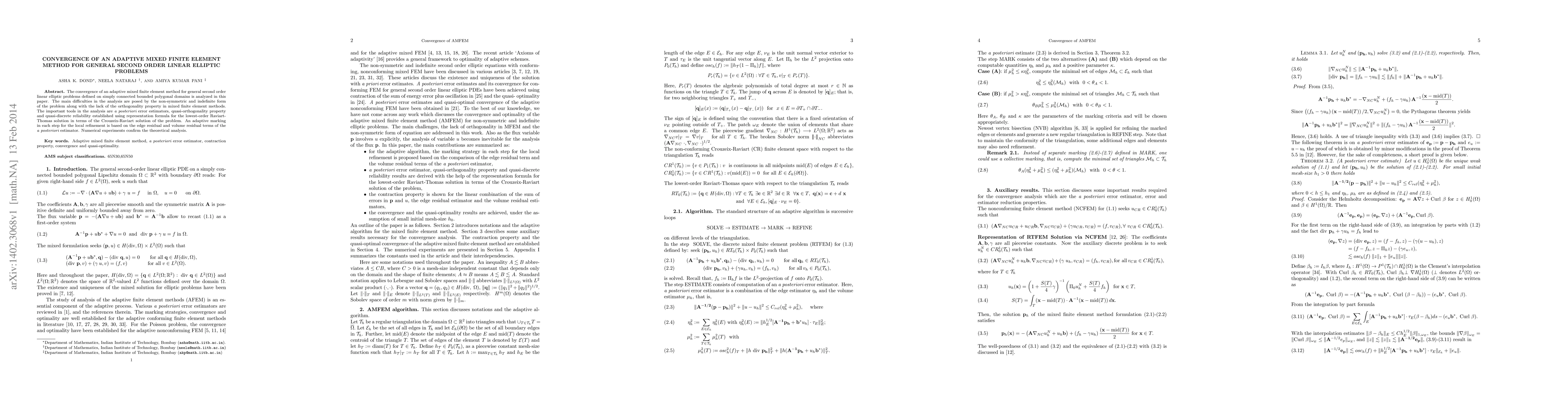 This paper analyzes the convergence of an adaptive mixed finite element method for general second-order linear elliptic problems, addressing challenges from non-symmetric forms and lack of orthogonality. It employs a posteriori error estimators, quasi-orthogonality, and adaptive marking for local refinement, supported by numerical experiments validating the theoretical analysis.