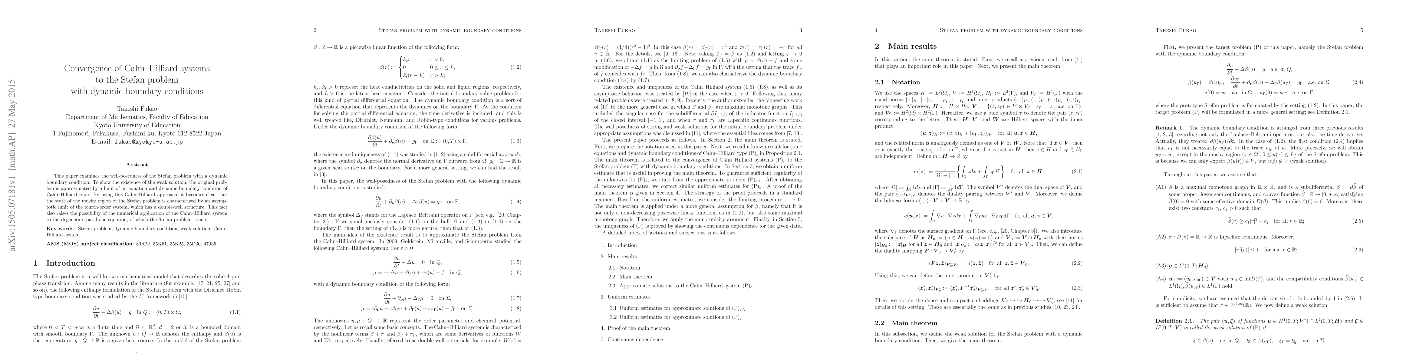 This paper examines the well-posedness of the Stefan problem with a dynamic boundary condition. To show the existence of the weak solution, the original problem is approximated by a limit of an equation and dynamic boundary condition of Cahn-Hilliard type. By using this Cahn-Hilliard approach, it becomes clear that the state of the mushy region of the Stefan problem is characterized by an asymptotic limit of the fourth-order system, which has a double-well structure. This fact also raises the possibility of the numerical application of the Cahn-Hilliard system to the degenerate parabolic equation, of which the Stefan problem is one.