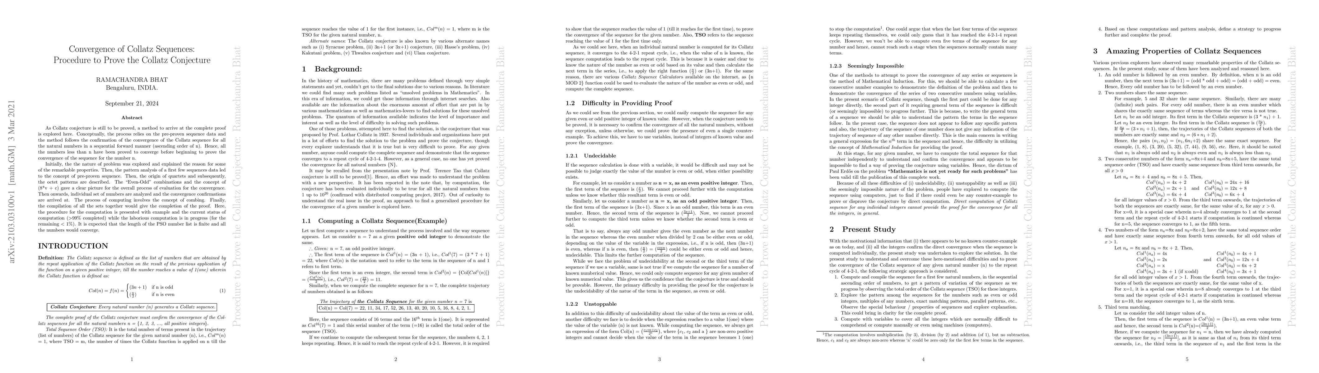 As Collatz conjecture is still to be proved, a method to arrive at the complete proof is explored here. Conceptually, the process relies on the pre-proven sequence data and the method follows the confirmation of the convergence of the Collatz sequence for all the natural numbers in a sequential forward manner (ascending order of n). Hence, all the numbers less than n have been proved to converge before beginning to prove the convergence of the sequence for the number n. Initially, the the nature of problem was explored and explained the reason for some of the remarkable properties. Then, the pattern analysis of a first few sequences data led to the concept of pre-proven sequence. Then, the origin of quartets and subsequently, the octet patterns are described. The "Even-Odd" combinations and the concept of (8*v + c) gave a clear picture for the overall process of evaluation for the convergence. Then onwards, individual set of numbers are analyzed and the convergence confirmations are arrived at. The process of computing involves the concept of combing. Finally, the compilation of all the sets together would give the completion of the proof. Here, the procedure for the computation is presented with example and the current status of computation ($>$99\% completed) while the laborious computation is in progress (for the remaining $<$ 1\%). It is expected that the length of the PSO number list is finite and all the numbers would converge.