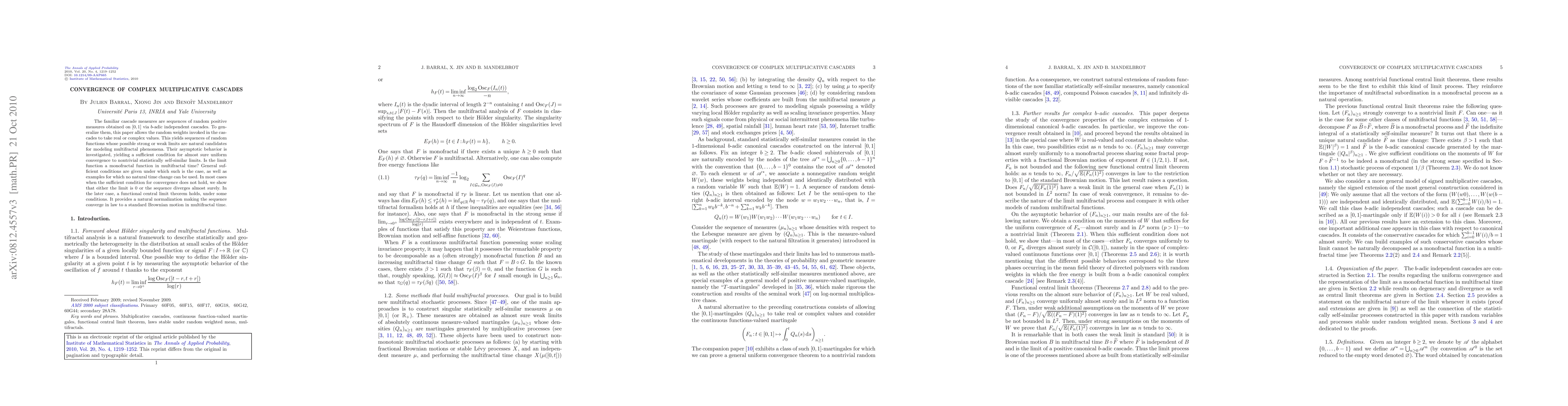 This paper generalizes the concept of cascade measures to allow for complex multiplicative cascades, investigating their asymptotic behavior and convergence. It provides conditions for almost sure uniform convergence to statistically self-similar limits, and explores cases where the limit is a monofractal function or diverges, with a functional central limit theorem showing convergence to standard Brownian motion under certain conditions.
