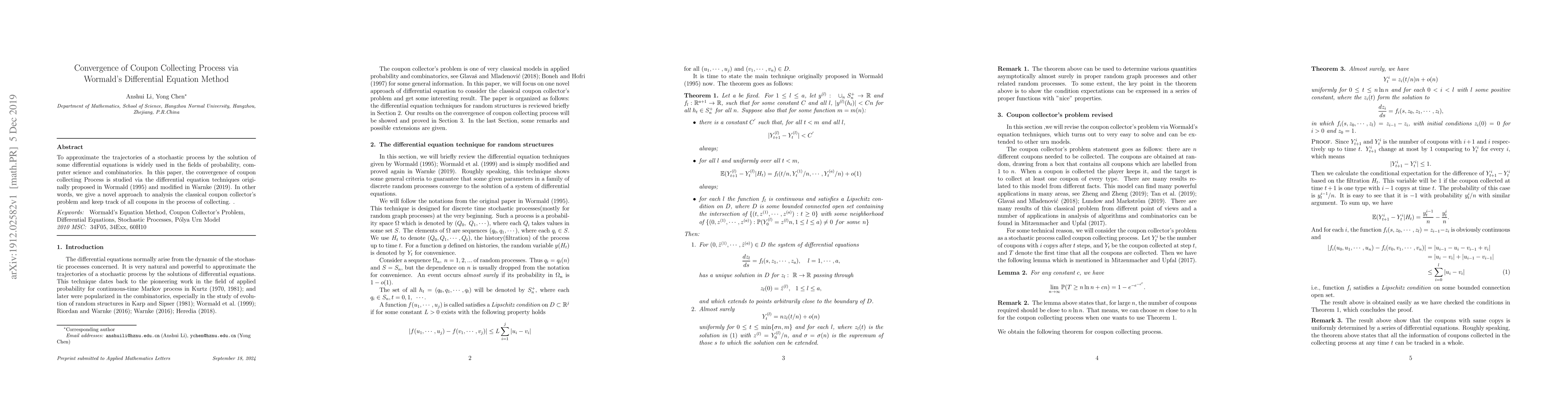 To approximate the trajectories of a stochastic process by the solution of some differential equation is widely used in the fields of probability, computer science and combinatorics. In this paper, the convergence of coupon collecting processes is studied via the differential equation techniques originally proposed in Wormald(1995) and modified in Warnke(2019). In other words, we give a novel approach to analysis the classical coupon collector's problem and keep track of all coupons in the process of collecting.