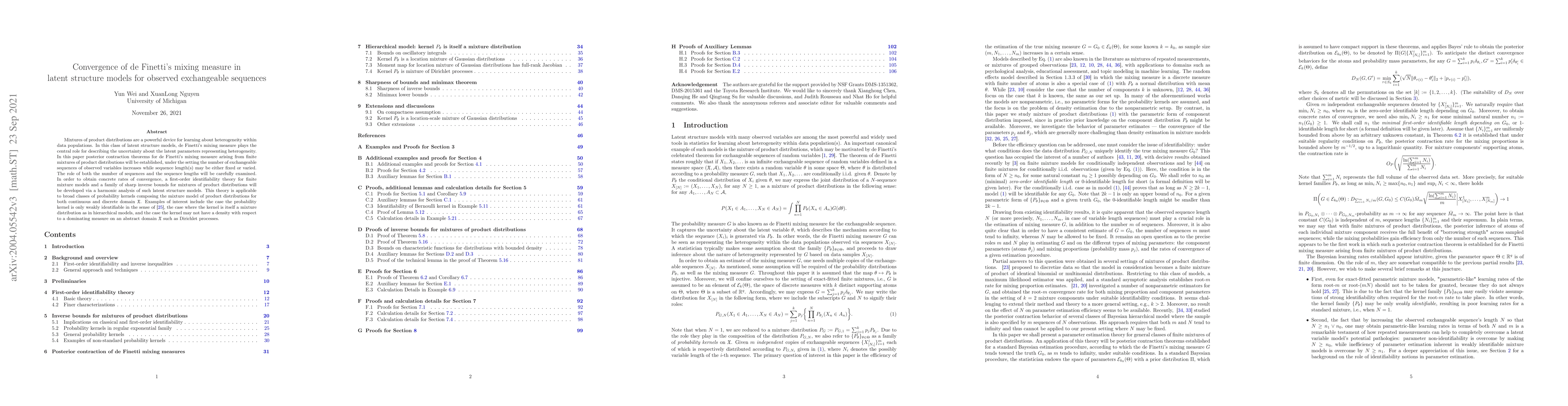 Mixtures of product distributions are a powerful device for learning about heterogeneity within data populations. In this class of latent structure models, de Finetti's mixing measure plays the central role for describing the uncertainty about the latent parameters representing heterogeneity. In this paper posterior contraction theorems for de Finetti's mixing measure arising from finite mixtures of product distributions will be established, under the setting the number of exchangeable sequences of observed variables increases while sequence length(s) may be either fixed or varied. The role of both the number of sequences and the sequence lengths will be carefully examined. In order to obtain concrete rates of convergence, a first-order identifiability theory for finite mixture models and a family of sharp inverse bounds for mixtures of product distributions will be developed via a harmonic analysis of such latent structure models. This theory is applicable to broad classes of probability kernels composing the mixture model of product distributions for both continuous and discrete domain $\mathfrak{X}$. Examples of interest include the case the probability kernel is only weakly identifiable in the sense of Ho and Nguyen (2016), the case where the kernel is itself a mixture distribution as in hierarchical models, and the case the kernel may not have a density with respect to a dominating measure on an abstract domain $\mathfrak{X}$ such as Dirichlet processes.