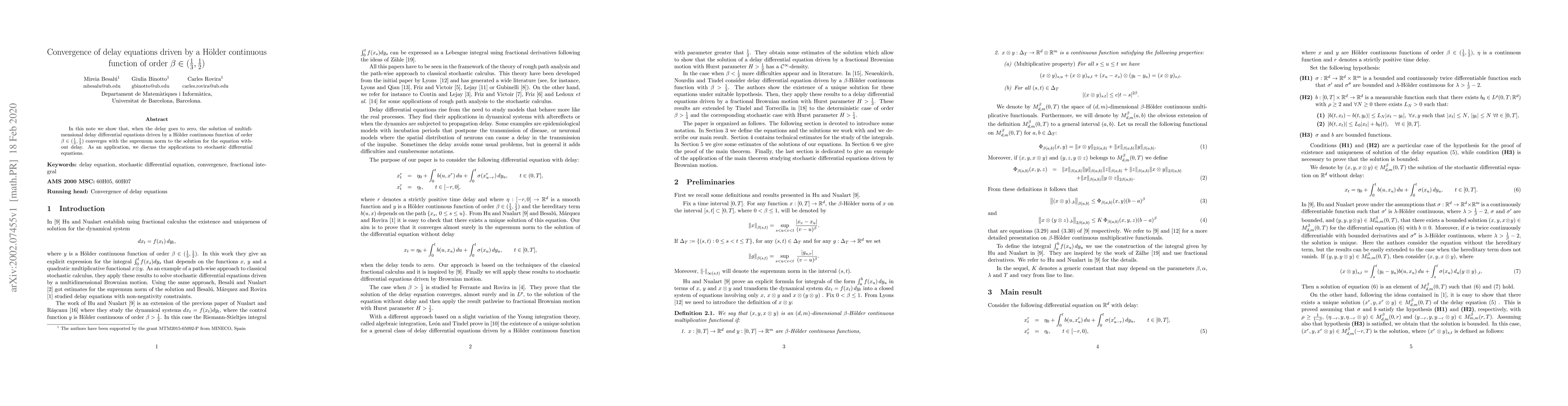 In this note we show that, when the delay goes to zero, the solution of multidimensional delay differential equations driven by a H\"older continuous function of order $\beta \in (\frac13,\frac12)$ converges with the supremum norm to the solution for the equation without delay. As an application, we discuss the applications to stochastic differential equations.