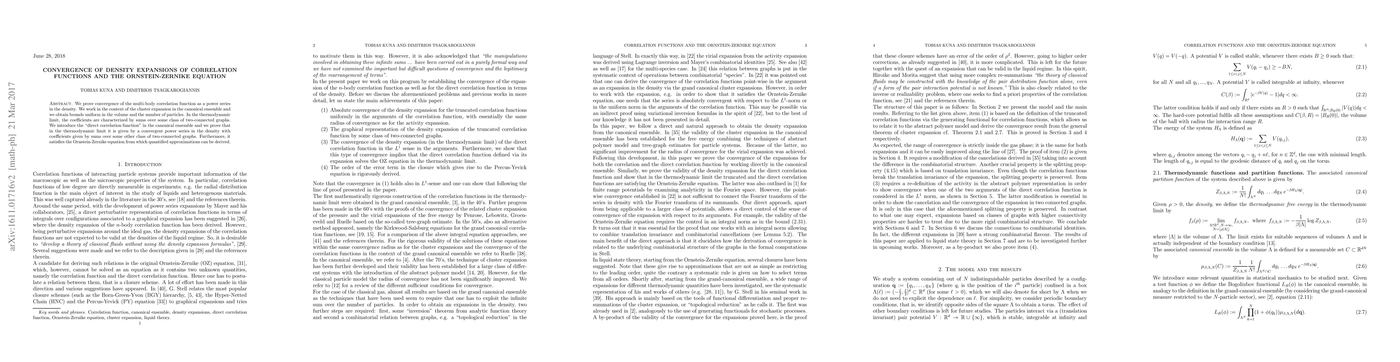 This paper proves convergence of correlation functions in a power series in density, introducing a direct correlation function that satisfies the Ornstein-Zernike equation, with implications for thermodynamic limits and approximations.