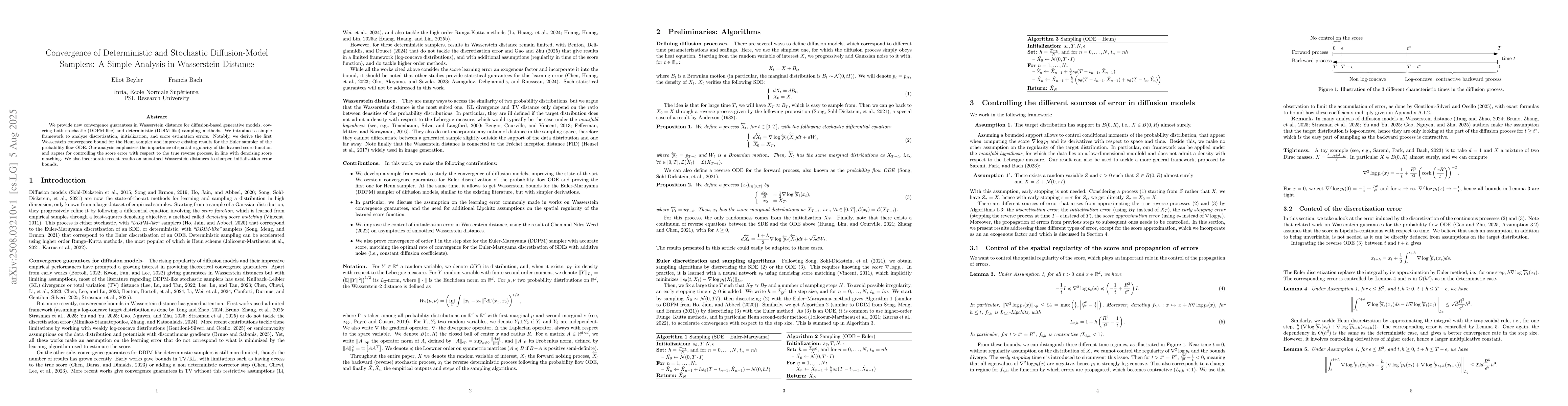 We provide new convergence guarantees in Wasserstein distance for diffusion-based generative models, covering both stochastic (DDPM-like) and deterministic (DDIM-like) sampling methods. We introduce a simple framework to analyze discretization, initialization, and score estimation errors. Notably, we derive the first Wasserstein convergence bound for the Heun sampler and improve existing results for the Euler sampler of the probability flow ODE. Our analysis emphasizes the importance of spatial regularity of the learned score function and argues for controlling the score error with respect to the true reverse process, in line with denoising score matching. We also incorporate recent results on smoothed Wasserstein distances to sharpen initialization error bounds.