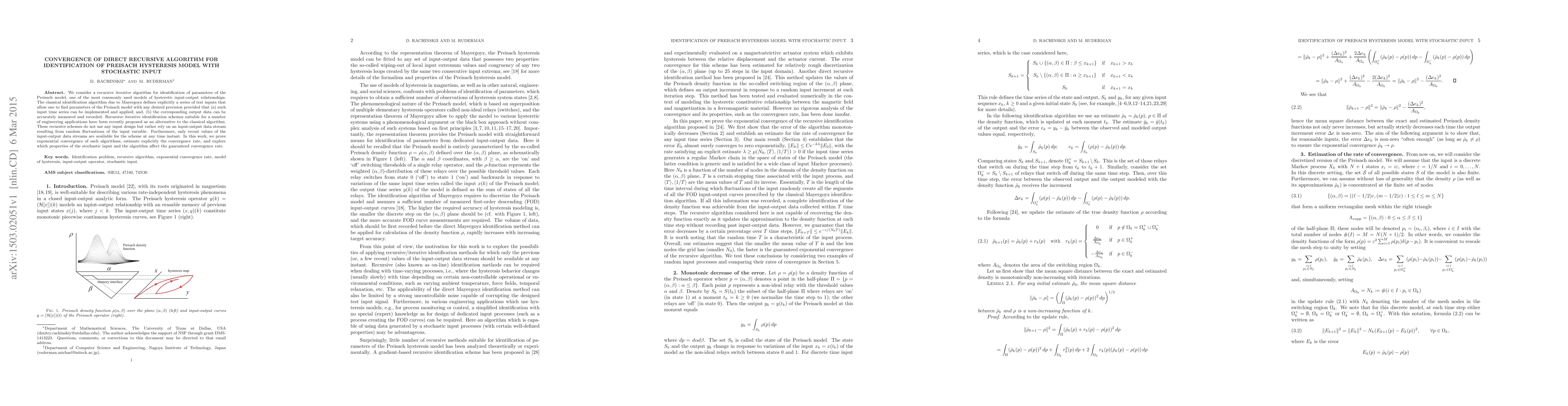 This paper investigates a recursive iterative algorithm for identifying parameters of the Preisach model, which describes hysteretic input-output relationships. It proves exponential convergence of the algorithm using stochastic inputs and estimates the convergence rate, analyzing how input properties influence the rate.