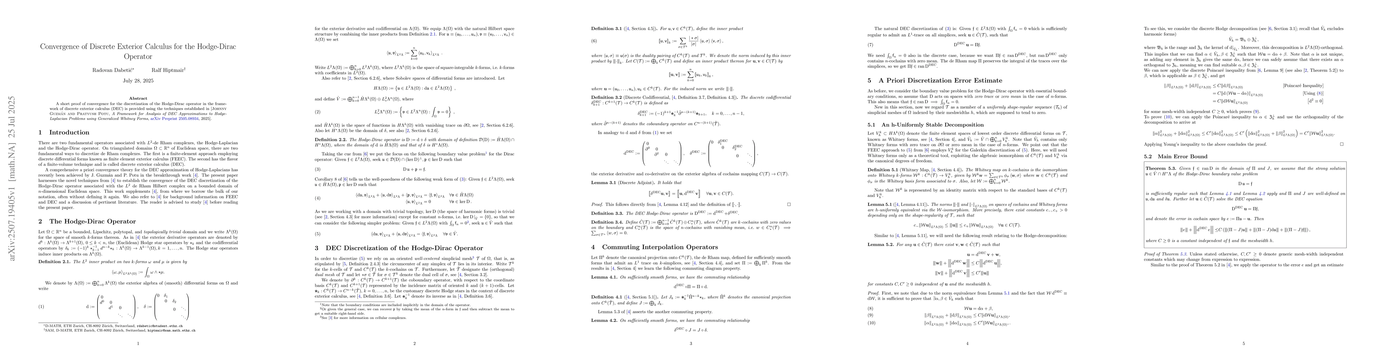 A short proof of convergence for the discretization of the Hodge-Dirac operator in the framework of discrete exterior calculus (DEC) is provided using the techniques established in [Johnny Guzm\'an and Pratyush Potu, A Framework for Analysis of DEC Approximations to Hodge-Laplacian Problems using Generalized Whitney Forms, arXiv:2505.08934, 2025]