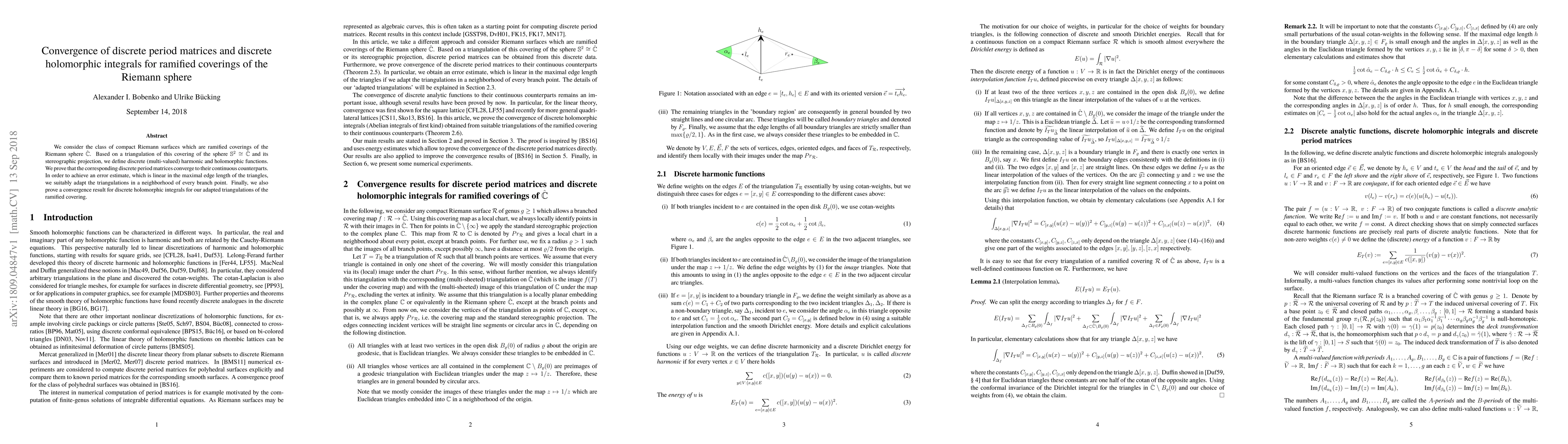 We consider the class of compact Riemann surfaces which are ramified coverings of the Riemann sphere $\hat{\mathbb{C}}$. Based on a triangulation of this covering of the sphere $\mathbb{S}^2\cong \hat{\mathbb{C}}$ and its stereographic projection, we define discrete (multi-valued) harmonic and holomorphic functions. We prove that the corresponding discrete period matrices converge to their continuous counterparts. In order to achieve an error estimate, which is linear in the maximal edge length of the triangles, we suitably adapt the triangulations in a neighborhood of every branch point. Finally, we also prove a convergence result for discrete holomorphic integrals for our adapted triangulations of the ramified covering.