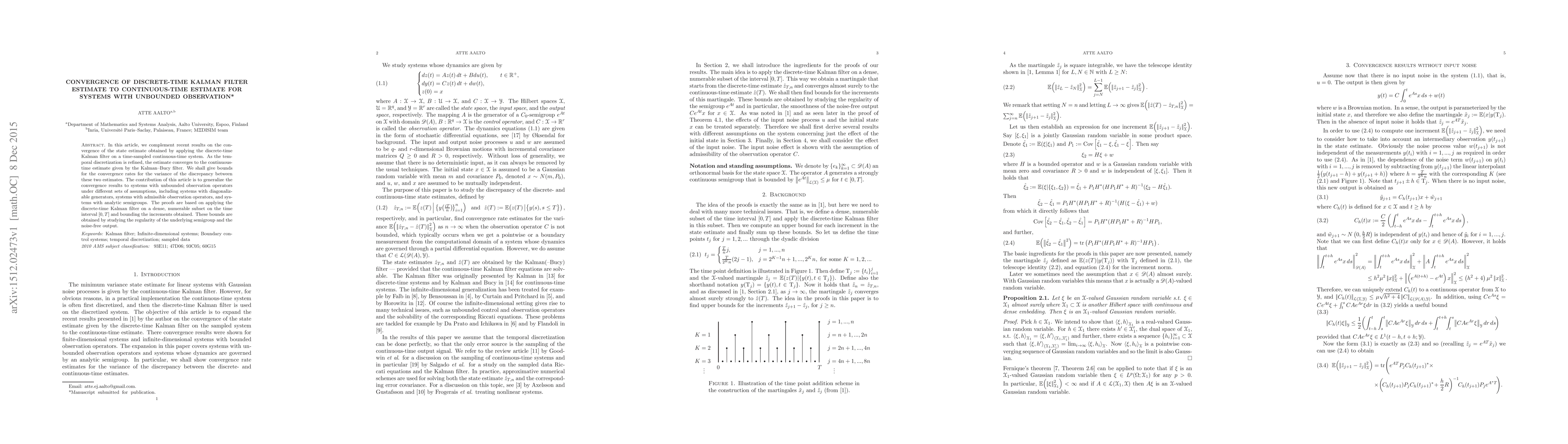 In this article, we complement recent results on the convergence of the state estimate obtained by applying the discrete-time Kalman filter on a time-sampled continuous-time system. As the temporal discretization is refined, the estimate converges to the continuous-time estimate given by the Kalman--Bucy filter. We shall give bounds for the convergence rates for the variance of the discrepancy between these two estimates. The contribution of this article is to generalize the convergence results to systems with unbounded observation operators under different sets of assumptions, including systems with diagonaliz-able generators, systems with admissible observation operators, and systems with analytic semigroups. The proofs are based on applying the discrete-time Kalman filter on a dense, numerable subset on the time interval [0,T] and bounding the increments obtained. These bounds are obtained by studying the regularity of the underlying semigroup and the noise-free output.