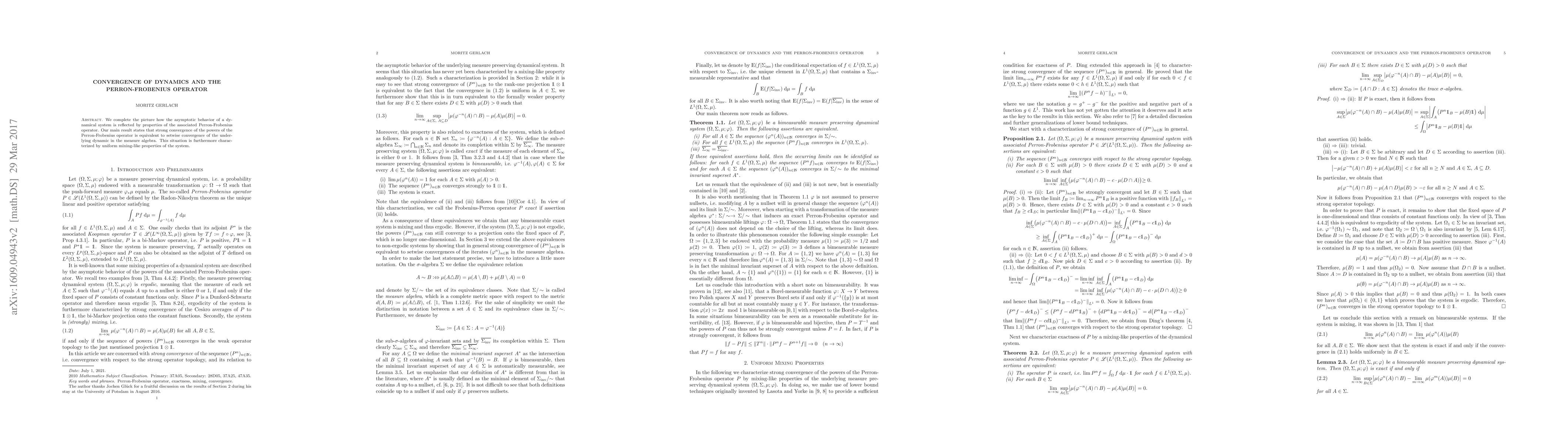 This paper establishes a connection between the asymptotic behavior of dynamical systems and the properties of the Perron-Frobenius operator, showing that strong convergence of the operator's powers corresponds to setwise convergence of the dynamics in the measure algebra, accompanied by a uniform mixing property.