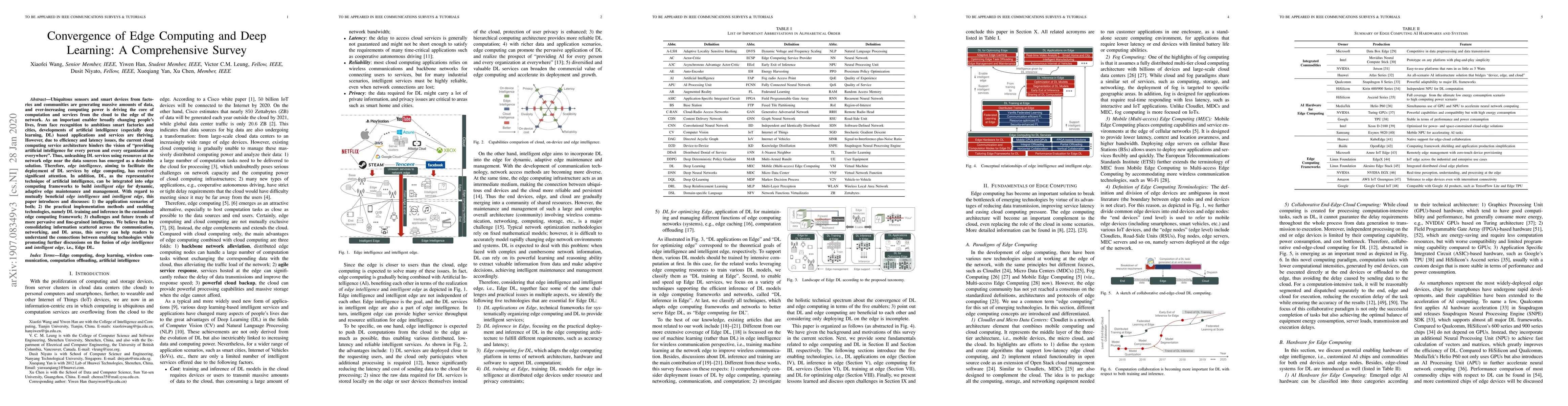 This paper surveys the convergence of edge computing and deep learning, highlighting their application scenarios, implementation methods, and enabling technologies. It discusses the challenges and future trends of integrating deep learning with edge computing to achieve more pervasive and fine-grained intelligence.