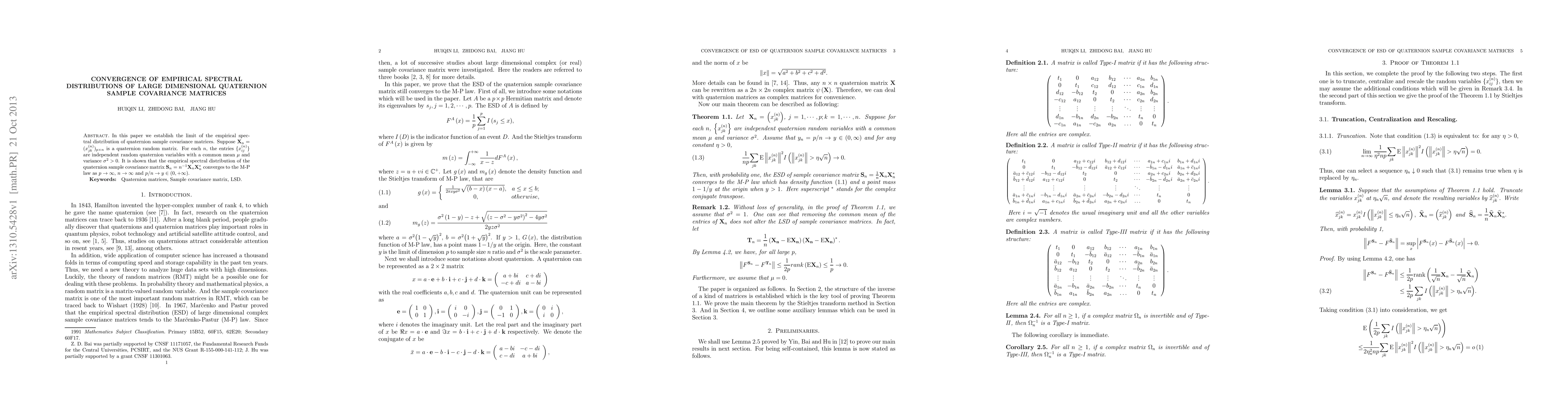 In this paper we establish the limit of the empirical spectral distribution of quaternion sample covariance matrices. Suppose $\mathbf X_n = ({x_{jk}^{(n)}})_{p\times n}$ is a quaternion random matrix. For each $n$, the entries $\{x_{ij}^{(n)}\}$ are independent random quaternion variables with a common mean $\mu$ and variance $\sigma^2>0$. It is shown that the empirical spectral distribution of the quaternion sample covariance matrix $\mathbf S_n=n^{-1}\mathbf X_n\mathbf X_n^*$ converges to the M-P law as $p\to\infty$, $n\to\infty$ and $p/n\to y\in(0,+\infty)$.