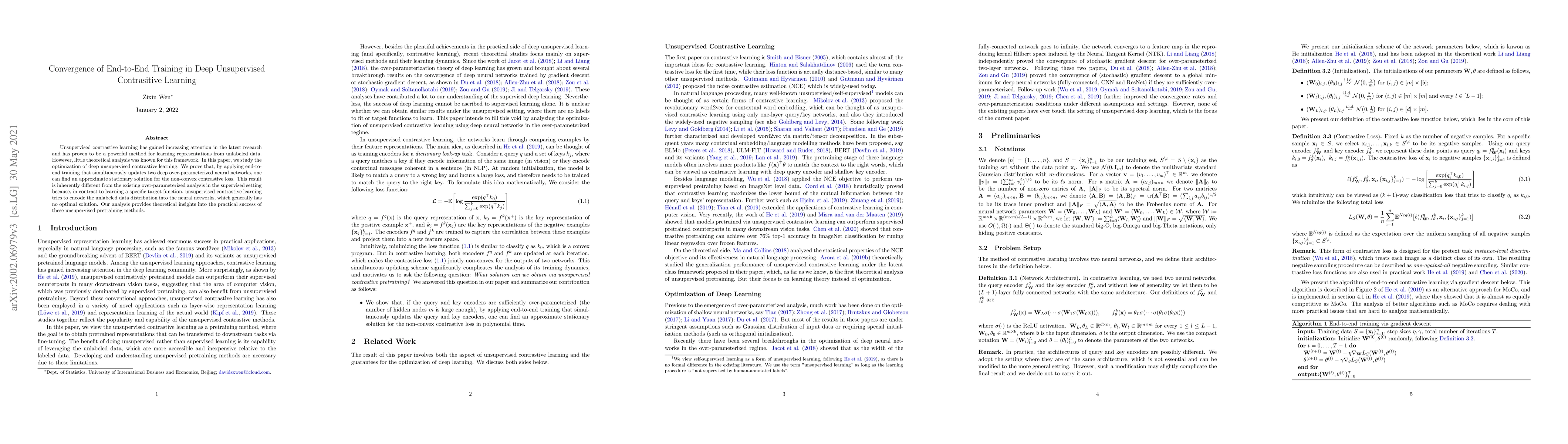 This paper investigates the optimization of deep unsupervised contrastive learning, demonstrating that end-to-end training of two neural networks can yield an approximate stationary solution for the non-convex contrastive loss, providing theoretical insights into the success of unsupervised pretraining methods. Unlike supervised learning, this method aims to encode the unlabeled data distribution into the networks, which lacks an optimal solution.