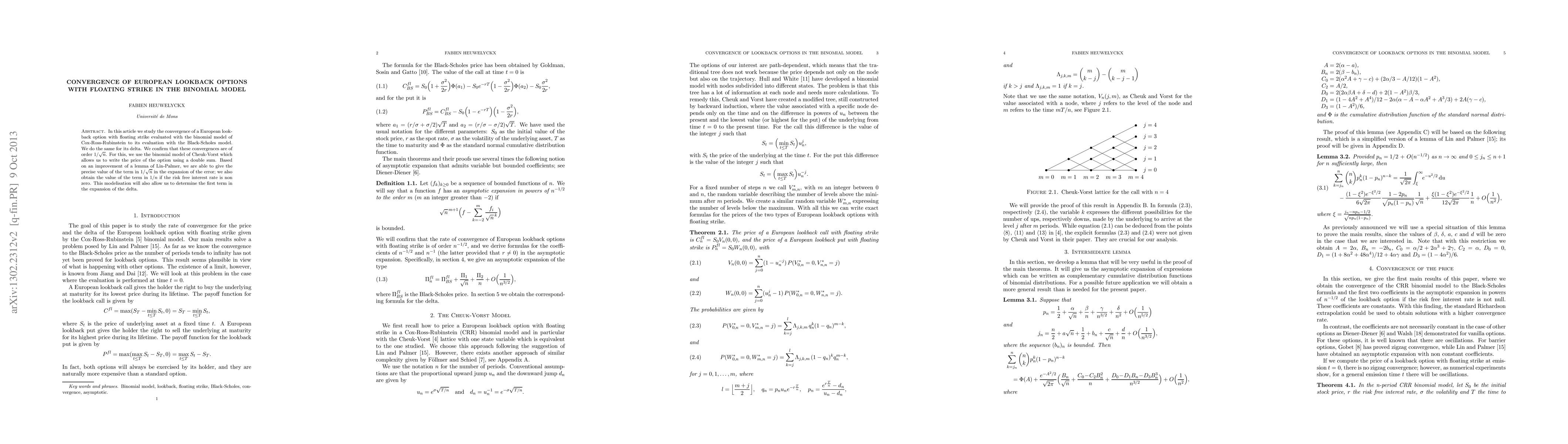 In this article we study the convergence of a European lookback option with floating strike evaluated with the binomial model of Cox-Ross-Rubinstein to its evaluation with the Black-Scholes model. We do the same for its delta. We confirm that these convergences are of order 1/Sqrt(n). For this, we use the binomial model of Cheuk-Vorst which allows us to write the price of the option using a double sum. Based on an improvement of a lemma of Lin-Palmer, we are able to give the precise value of the term in 1/Sqrt(n) in the expansion of the error; we also obtain the value of the term in 1/n if the risk free interest rate is non zero. This modelisation will also allow us to determine the first term in the expansion of the delta.