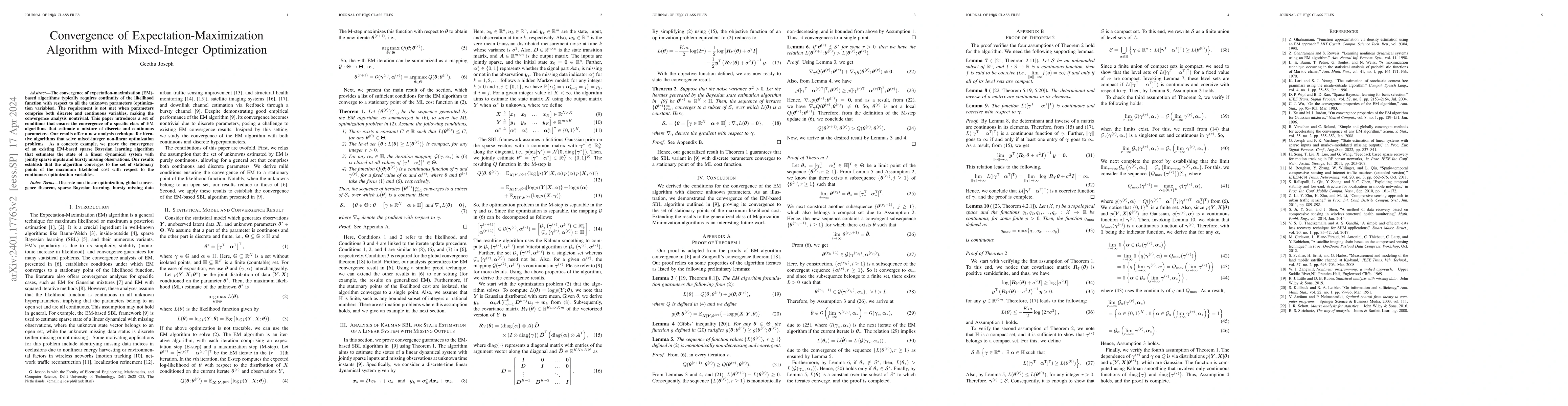 This paper establishes conditions for the convergence of EM algorithms that handle mixed-integer optimization problems, specifically addressing the challenge when parameters include both discrete and continuous variables. It demonstrates the convergence of a sparse Bayesian learning algorithm for linear dynamical systems with sparse inputs and missing observations.