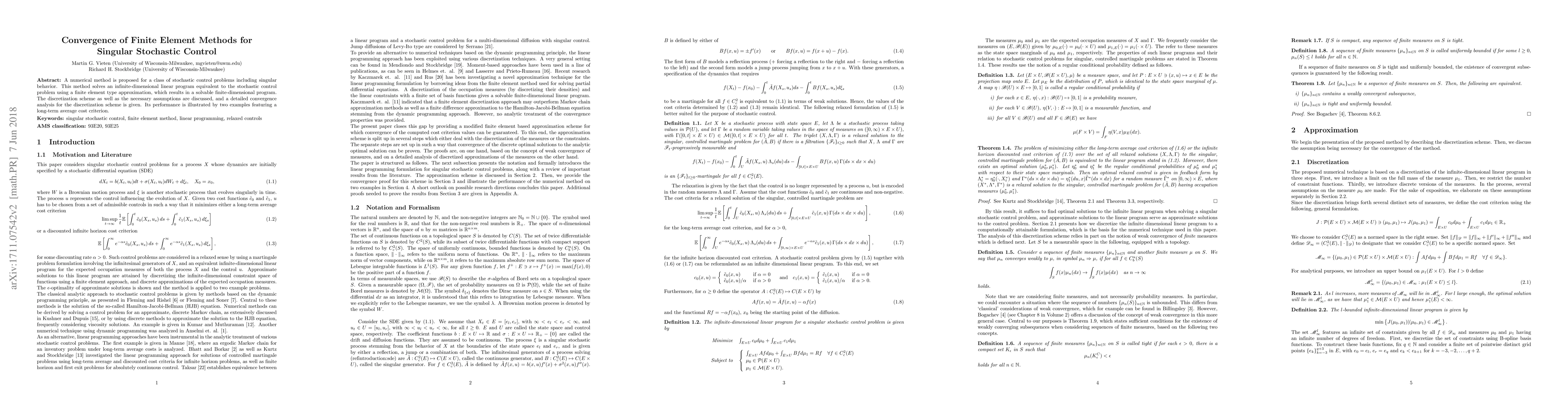 A numerical method is proposed for a class of stochastic control problems including singular behavior. This method solves an infinite-dimensional linear program equivalent to the stochastic control problem using a finite element type approximation, which results in a solvable finite-dimensional program. The discretization scheme as well as the necessary assumptions are discussed, and a detailed convergence analysis for the discretization scheme is given. Its performance is illustrated by two examples featuring a long-term average cost criterion.