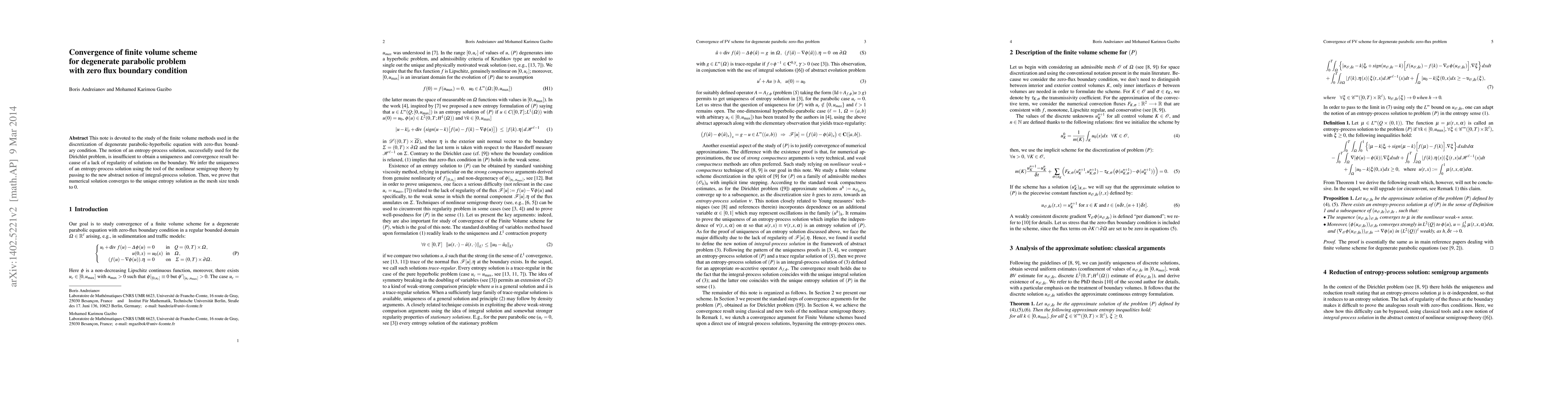 This paper investigates finite volume methods for solving a degenerate parabolic-hyperbolic equation with zero-flux boundary conditions, proving convergence and uniqueness of the numerical solution via nonlinear semigroup theory. Traditional entropy solutions are insufficient due to boundary irregularities, leading to a new integral-process solution concept.