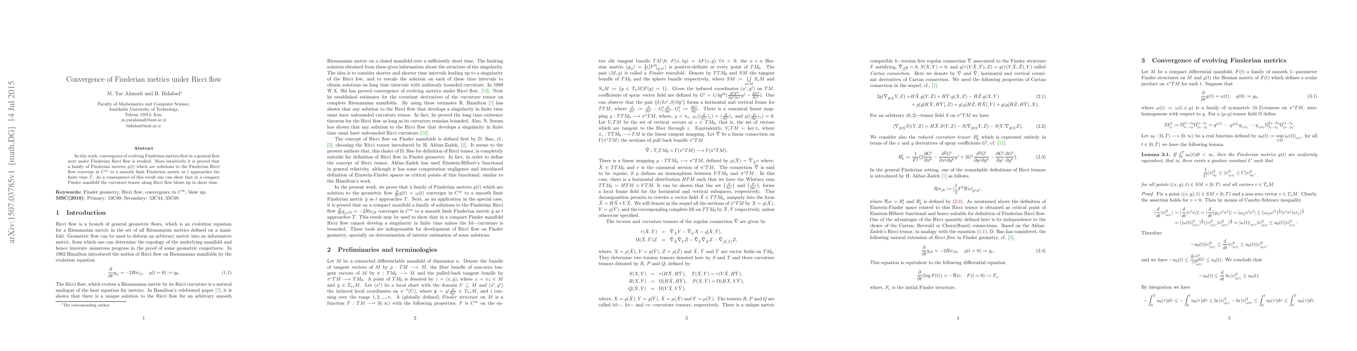 This paper studies the convergence of evolving Finslerian metrics under Ricci flow, proving that a family of such metrics converges smoothly to a limit as time approaches a finite endpoint. It also demonstrates that in compact Finsler manifolds, the curvature tensor along Ricci flow diverges in a short time.