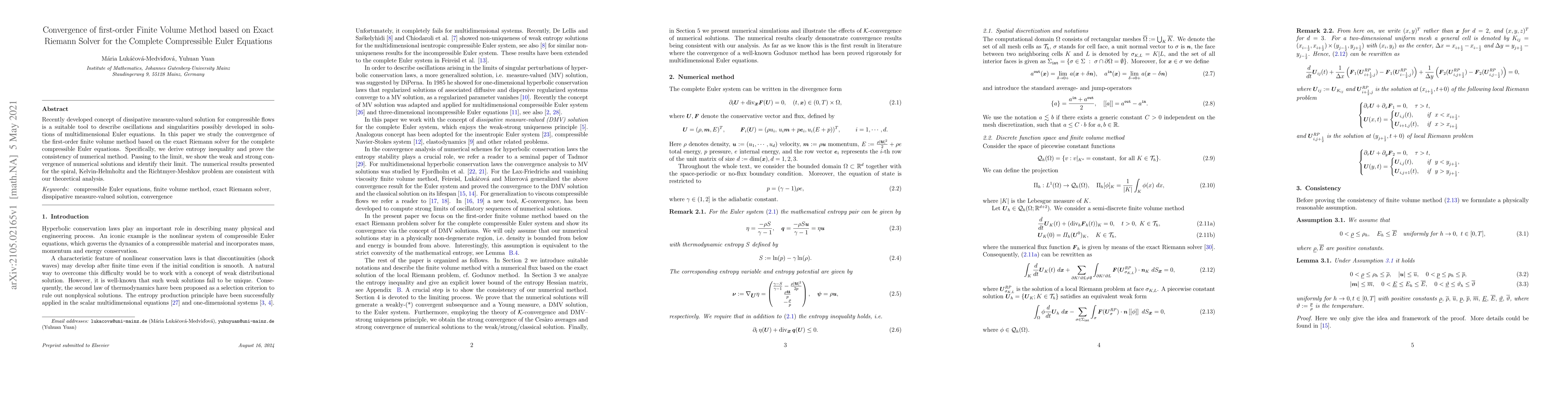 This paper investigates the convergence of a first-order finite volume method using an exact Riemann solver for the compressible Euler equations, proving its consistency and deriving an entropy inequality. It demonstrates weak and strong convergence of numerical solutions, with results from specific problems aligning with theoretical findings.