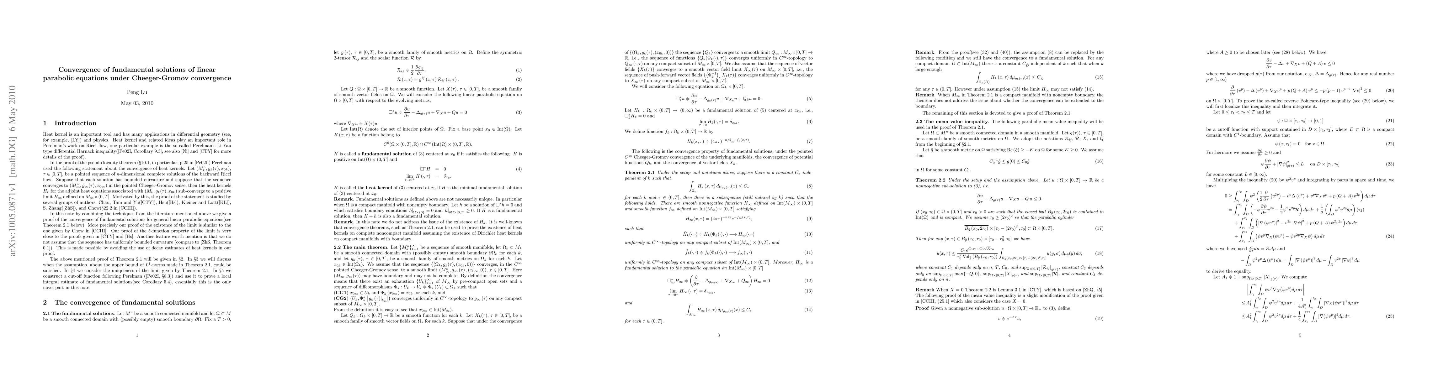 This research paper shows that fundamental solutions of linear parabolic equations converge under certain conditions, including Cheeger-Gromov convergence of the underlying manifolds and a uniform $L^1$-bound on the solutions.