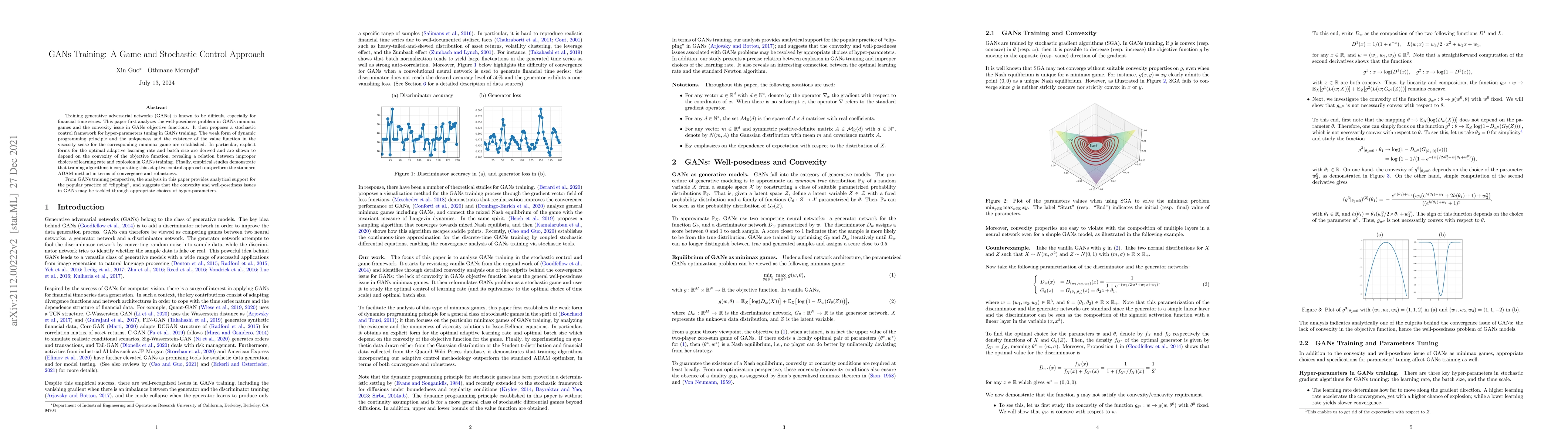 Training generative adversarial networks (GANs) is known to be difficult, especially for financial time series. This paper first analyzes the well-posedness problem in GANs minimax games and the convexity issue in GANs objective functions. It then proposes a stochastic control framework for hyper-parameters tuning in GANs training. The weak form of dynamic programming principle and the uniqueness and the existence of the value function in the viscosity sense for the corresponding minimax game are established. In particular, explicit forms for the optimal adaptive learning rate and batch size are derived and are shown to depend on the convexity of the objective function, revealing a relation between improper choices of learning rate and explosion in GANs training. Finally, empirical studies demonstrate that training algorithms incorporating this adaptive control approach outperform the standard ADAM method in terms of convergence and robustness. From GANs training perspective, the analysis in this paper provides analytical support for the popular practice of ``clipping'', and suggests that the convexity and well-posedness issues in GANs may be tackled through appropriate choices of hyper-parameters.