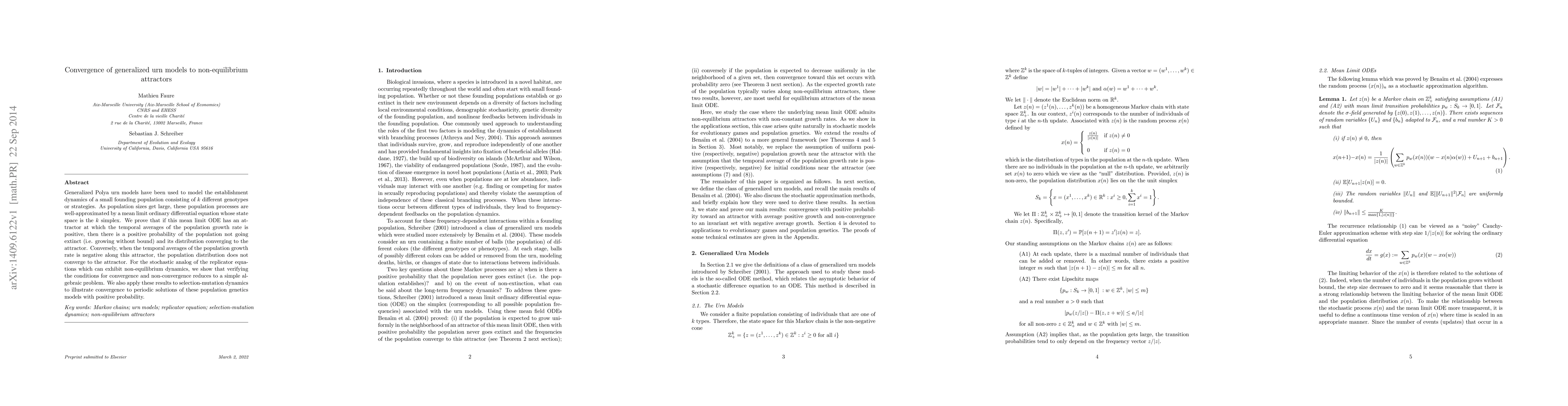 Generalized Polya urn models have been used to model the establishment dynamics of a small founding population consisting of k different genotypes or strategies. As population sizes get large, these population processes are well-approximated by a mean limit ordinary differential equation whose state space is the k simplex. We prove that if this mean limit ODE has an attractor at which the temporal averages of the population growth rate is positive, then there is a positive probability of the population not going extinct (i.e. growing without bound) and its distribution converging to the attractor. Conversely, when the temporal averages of the population growth rate is negative along this attractor, the population distribution does not converge to the attractor. For the stochastic analog of the replicator equations which can exhibit non-equilibrium dynamics, we show that verifying the conditions for convergence and non-convergence reduces to a simple algebraic problem. We also apply these results to selection-mutation dynamics to illustrate convergence to periodic solutions of these population genetics models with positive probability.