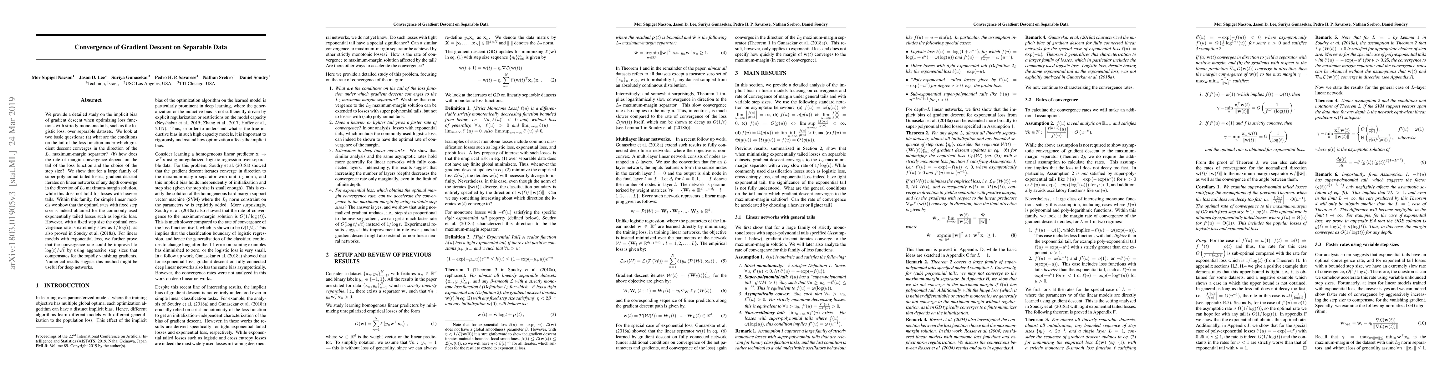 We provide a detailed study on the implicit bias of gradient descent when optimizing loss functions with strictly monotone tails, such as the logistic loss, over separable datasets. We look at two basic questions: (a) what are the conditions on the tail of the loss function under which gradient descent converges in the direction of the $L_2$ maximum-margin separator? (b) how does the rate of margin convergence depend on the tail of the loss function and the choice of the step size? We show that for a large family of super-polynomial tailed losses, gradient descent iterates on linear networks of any depth converge in the direction of $L_2$ maximum-margin solution, while this does not hold for losses with heavier tails. Within this family, for simple linear models we show that the optimal rates with fixed step size is indeed obtained for the commonly used exponentially tailed losses such as logistic loss. However, with a fixed step size the optimal convergence rate is extremely slow as $1/\log(t)$, as also proved in Soudry et al. (2018). For linear models with exponential loss, we further prove that the convergence rate could be improved to $\log (t) /\sqrt{t}$ by using aggressive step sizes that compensates for the rapidly vanishing gradients. Numerical results suggest this method might be useful for deep networks.