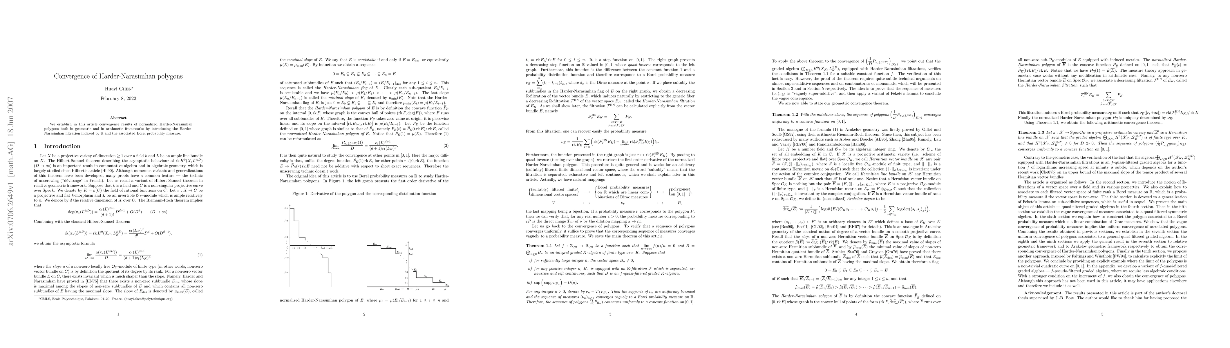 This paper presents convergence results for normalized Harder-Narasimhan polygons within both geometric and arithmetic settings. It introduces a filtration indexed by $\mathbb{R}$ and a related Borel probability measure to achieve this convergence.