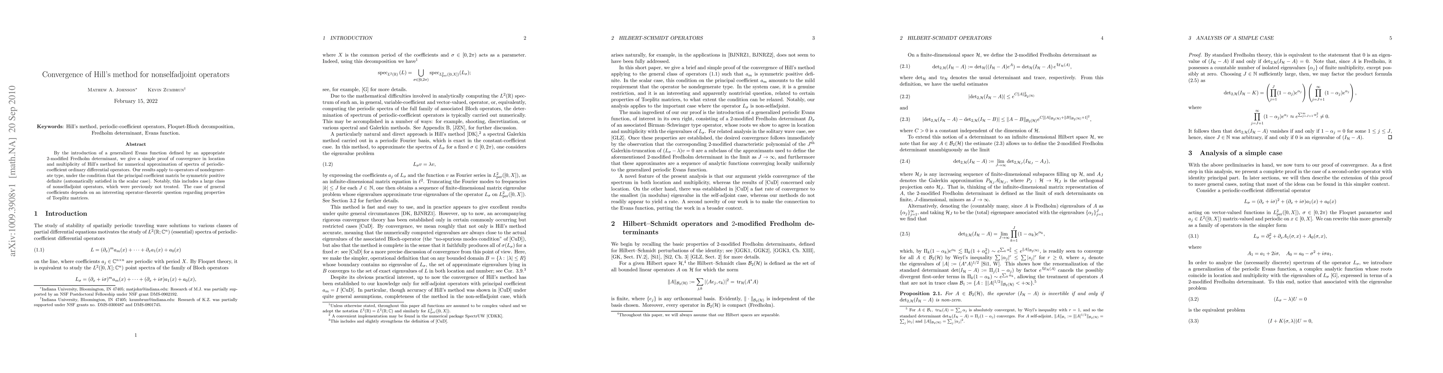 By the introduction of a generalized Evans function defined by an appropriate 2-modified Fredholm determinant, we give a simple proof of convergence in location and multiplicity of Hill's method for numerical approximation of spectra of periodic-coefficient ordinary differential operators. Our results apply to operators of nondegenerate type, under the condition that the principal coefficient matrix be symmetric positive definite (automatically satisfied in the scalar case). Notably, this includes a large class of nonselfadjoint operators, which were previously not treated. The case of general coefficients depends on an interesting operator-theoretic question regarding properties of Toeplitz matrices.