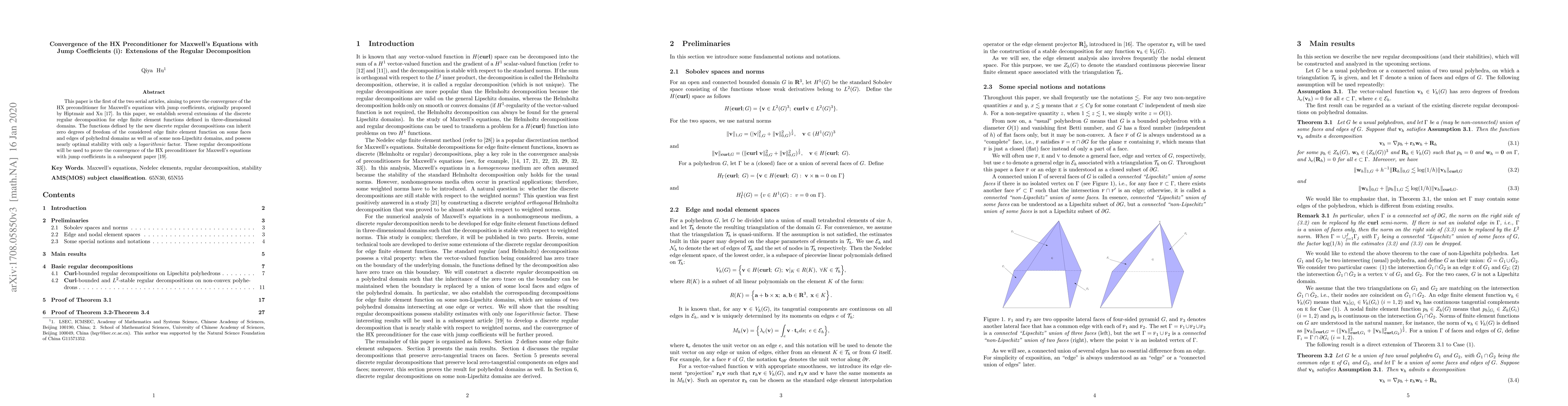 This paper is the first one of two serial articles, whose goal is to prove convergence of HX Preconditioner (proposed by Hiptmair and Xu 2007) for Maxwell's equations with jump coefficients. In this paper we establish various extensions of the regular Helmholtz decomposition for edge finite element functions defined in three dimensional domains. The functions defined by the regular Helmholtz decompositions can preserve the zero tangential complement on faces and edges of polyhedral domains and some non-Lipchitz domains, and possess stability estimates with only a $logarithm$ factor. These regular Helmholtz decompositions will be used to prove convergence of the HX preconditioner for Maxwell's equations with jump coefficients in another paper (Hu 2017).
