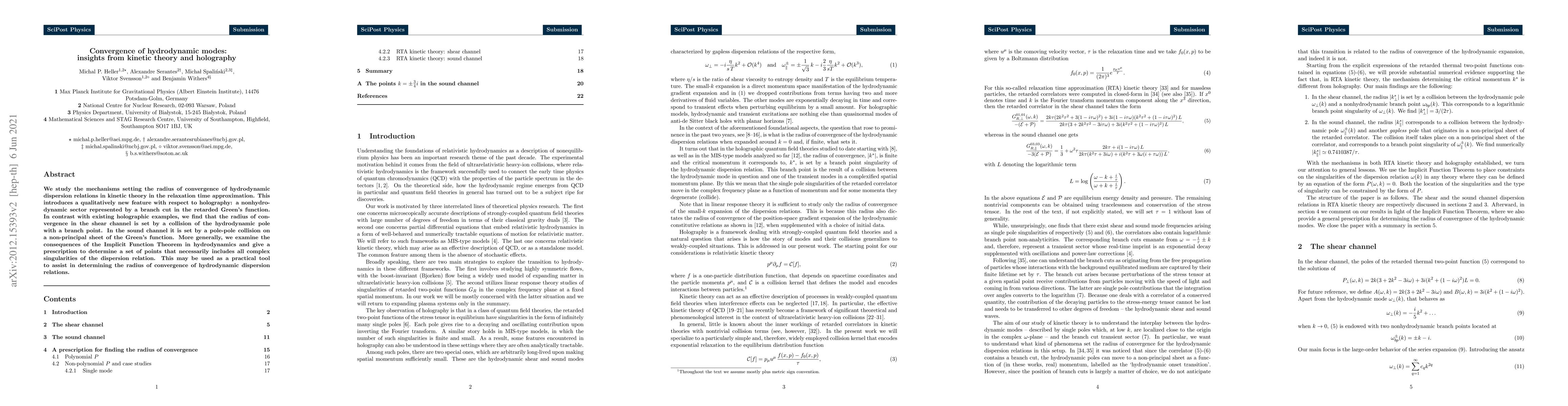 This paper investigates the radius of convergence for hydrodynamic dispersion relations in kinetic theory, revealing new insights into nonhydrodynamic sectors through holography. It identifies distinct collision mechanisms—pole-branch and pole-pole—that determine the convergence radius in different channels, providing a practical tool based on the Implicit Function Theorem for identifying complex singularities.