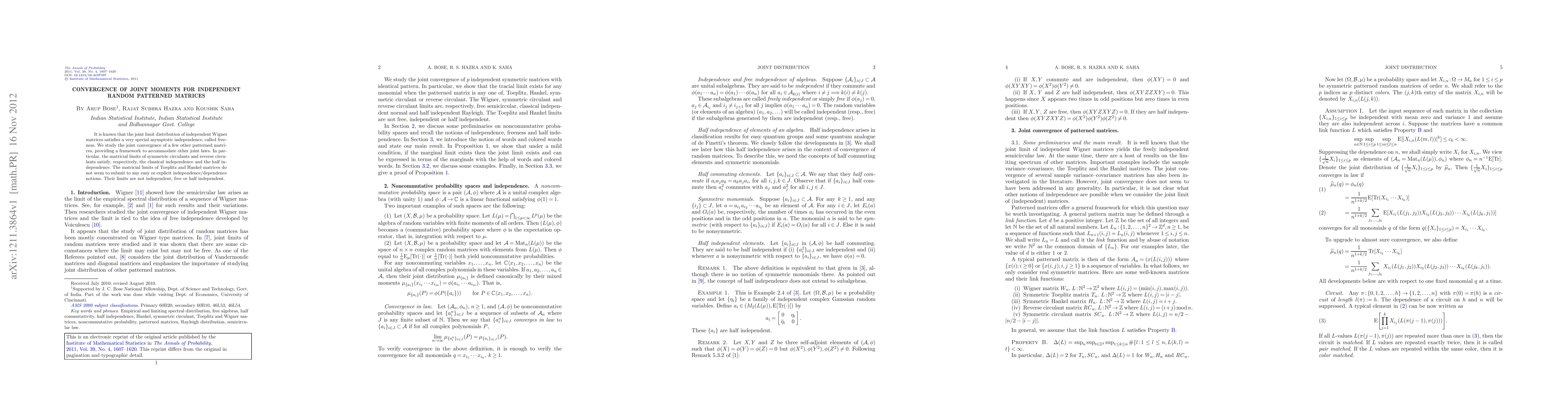 This paper investigates joint convergence of independent patterned matrices, finding that symmetric circulants and reverse circulants converge to classical independence, while Toeplitz and Hankel matrices do not follow any easy independence/dependence notions.
