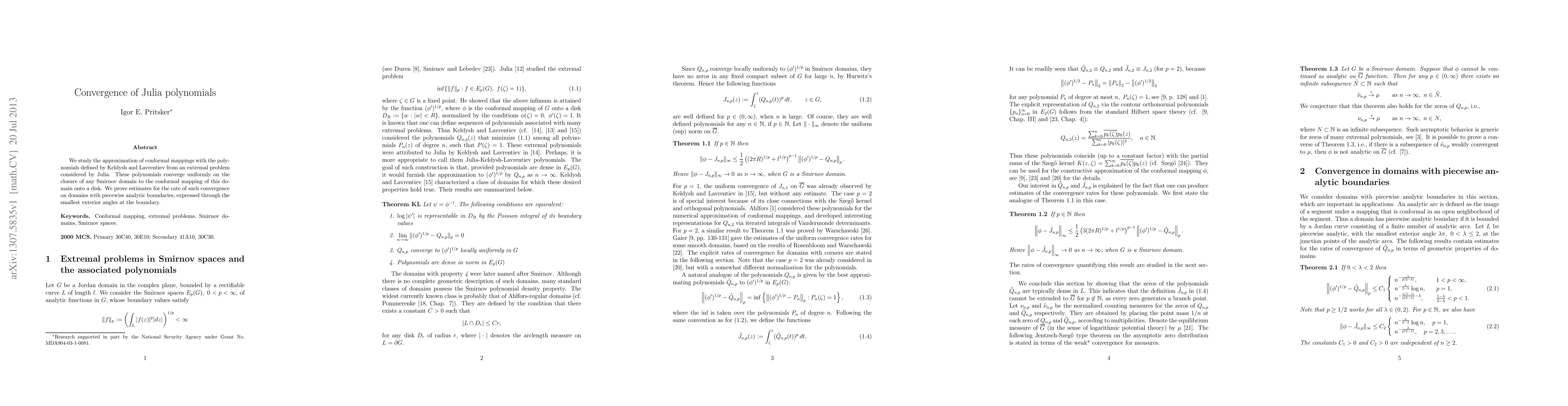 We study the approximation of conformal mappings with the polynomials defined by Keldysh and Lavrentiev from an extremal problem considered by Julia. These polynomials converge uniformly on the closure of any Smirnov domain to the conformal mapping of this domain onto a disk. We prove estimates for the rate of such convergence on domains with piecewise analytic boundaries, expressed through the smallest exterior angles at the boundary.